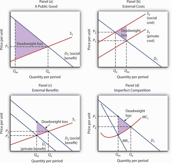 Figure 15.3 "Correcting Market Failure" reviews the potential gain from government intervention in cases of market failure. In each case, the potential gain is the deadweight loss resulting from market failure; government intervention may prevent or limit this deadweight loss. In each panel, the deadweight loss resulting from market failure is shown as a shaded triangle.