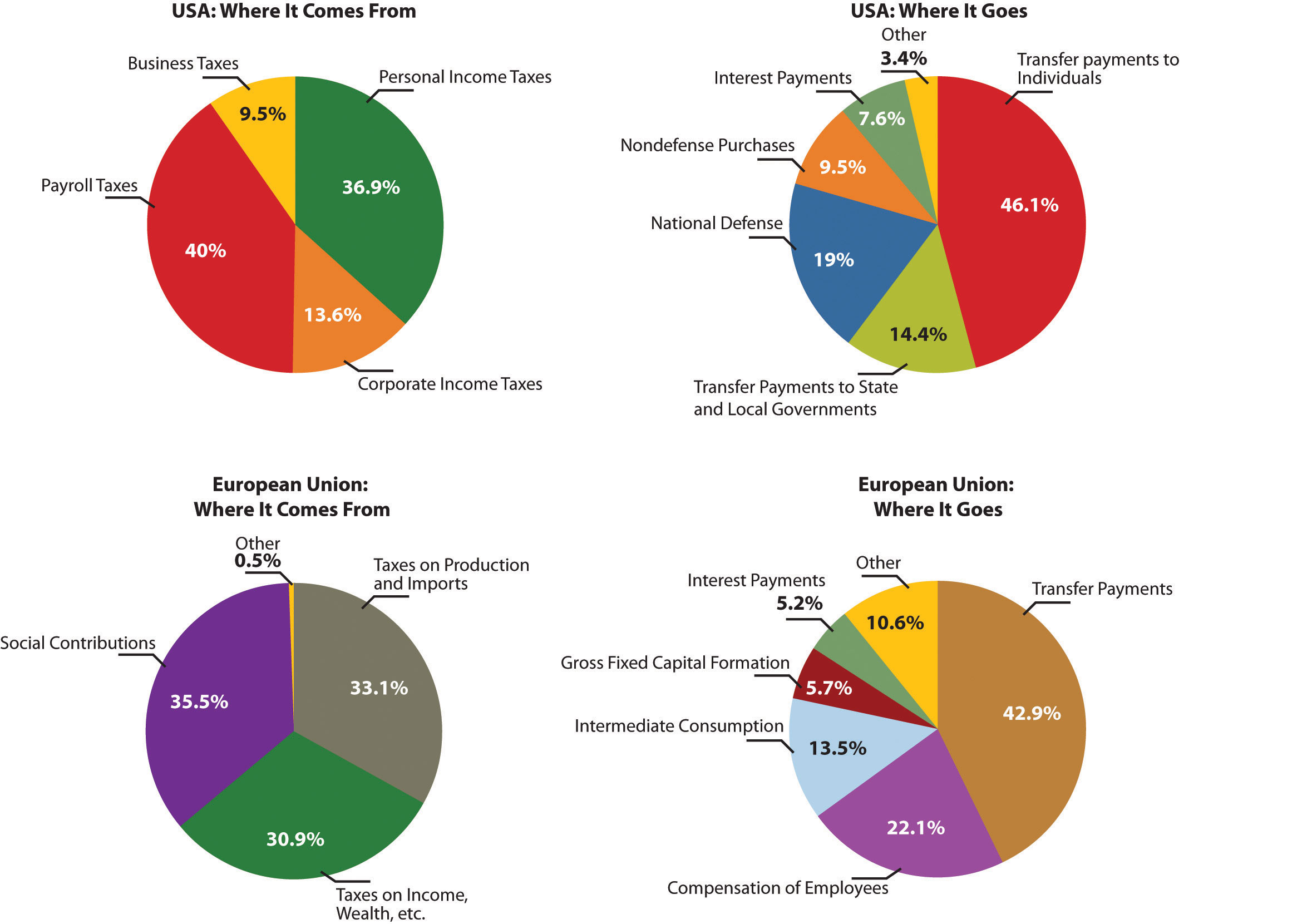 Figure 15.2 "Government Revenue Sources and Expenditures: 2009" summarizes the main revenue sources and types of expenditures for the U.S. federal government and for the European Union. In the United States, most revenues came from personal income taxes and from payroll taxes. Most expenditures were for transfer payments to individuals. Federal purchases were primarily for national defense; the “other purchases” category includes things such as spending for transportation projects and for the space program. Interest payments on the national debt and grants by the federal government to state and local governments were the other major expenditures. The situation in the European Union differs primarily by the fact that a greater share of revenue comes from taxes on production and imports and substantially less is spent on defense.