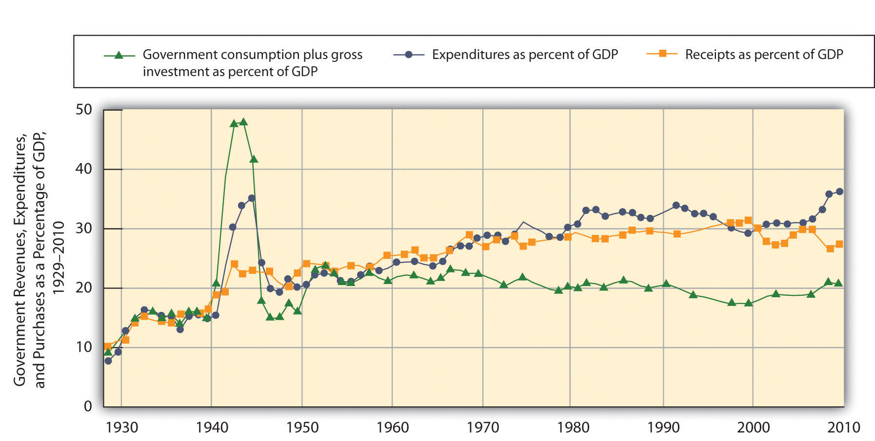 Figure 15.1 "Government Expenditures and Revenues as a Percentage of GDP" shows total government expenditures and revenues as a percentage of GDP from 1929 to 2010. All levels of government are included. Government expendituresAll spending by government agencies. include all spending by government agencies. Government revenuesAll funds received by government agencies. include all funds received by government agencies. The primary component of government revenues is taxes; revenue also includes miscellaneous receipts from fees, fines, and other sources. We will look at types of government revenues and expenditures later in this chapter.