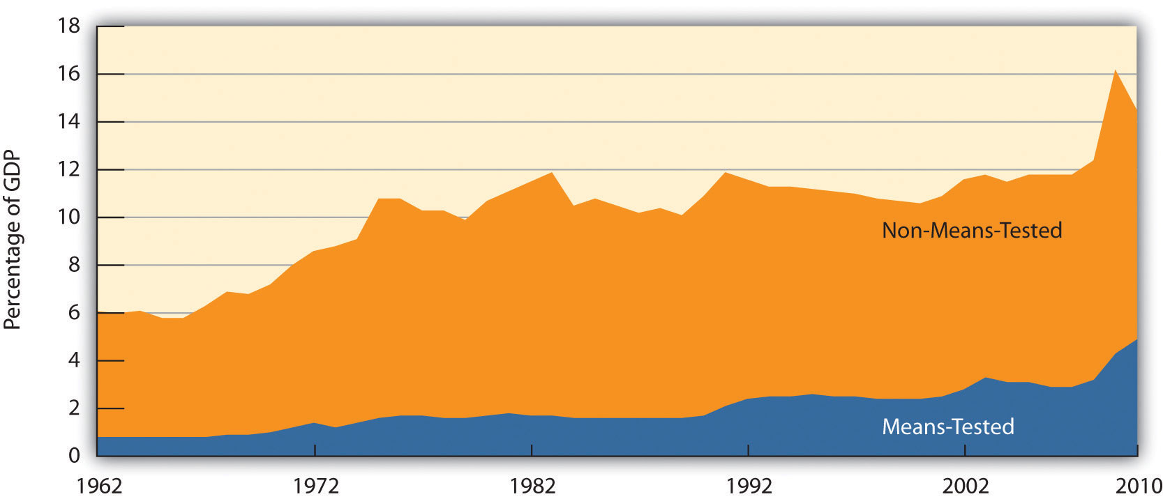 Figure 15.4 "Federal Transfer Payment Spending" shows federal spending on means-tested and non-means-tested programs as a percentage of GDP, the total value of output, since 1962. As the chart suggests, the bulk of income redistribution efforts in the United States are non-means-tested programs.