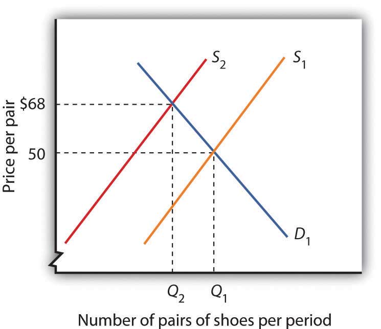 The quota shifts the supply curve to the left, increasing the price of shoes in the United States and reducing the equilibrium quantity. In the case shown, the price rises to $68. Because you are not given the precise positions of the demand and supply curves, you can only conclude that price rises; your graph may suggest a different price. The important thing is that the new price is greater than $50.