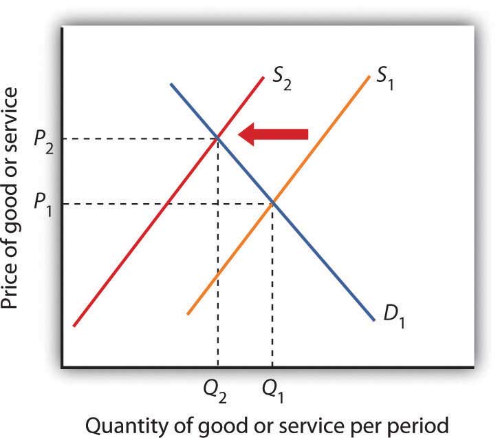 Protectionist policies reduce the quantities of foreign goods and services supplied to the country that imposes the restriction. As a result, such policies shift the supply curve to the left for the good or service whose imports are restricted. In the case shown, the supply curve shifts to S2, the equilibrium price rises to P2, and the equilibrium quantity falls to Q2.