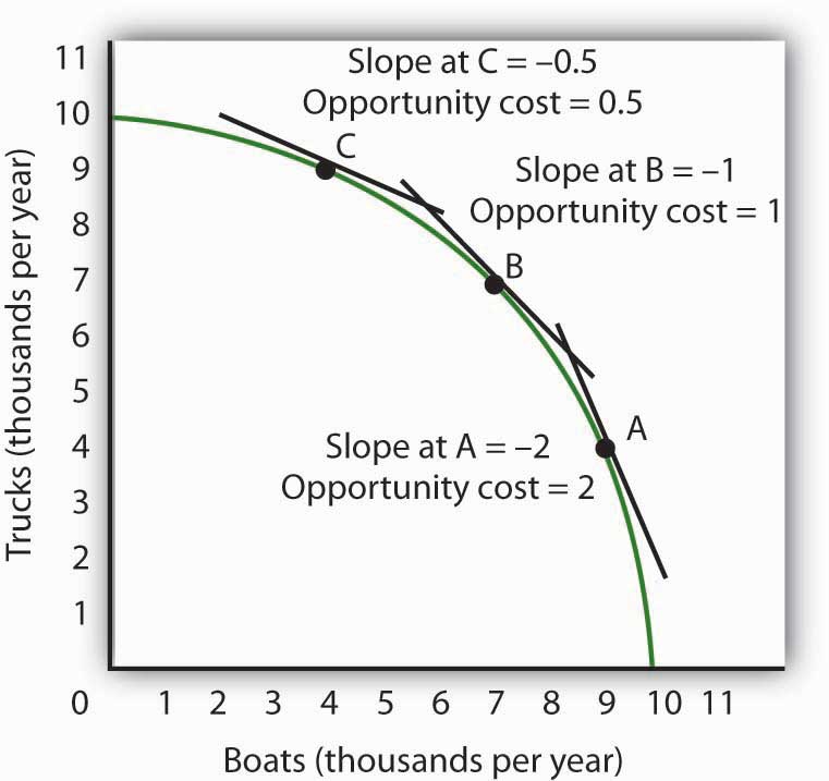 The slope of the production possibilities curve at any point is equal to the slope of a line tangent to the curve at that point. The absolute value of the slope equals the opportunity cost of increased boat production. Moving down and to the right along its production possibilities curve, the opportunity cost of boat production increases; this is an application of the law of increasing opportunity cost.