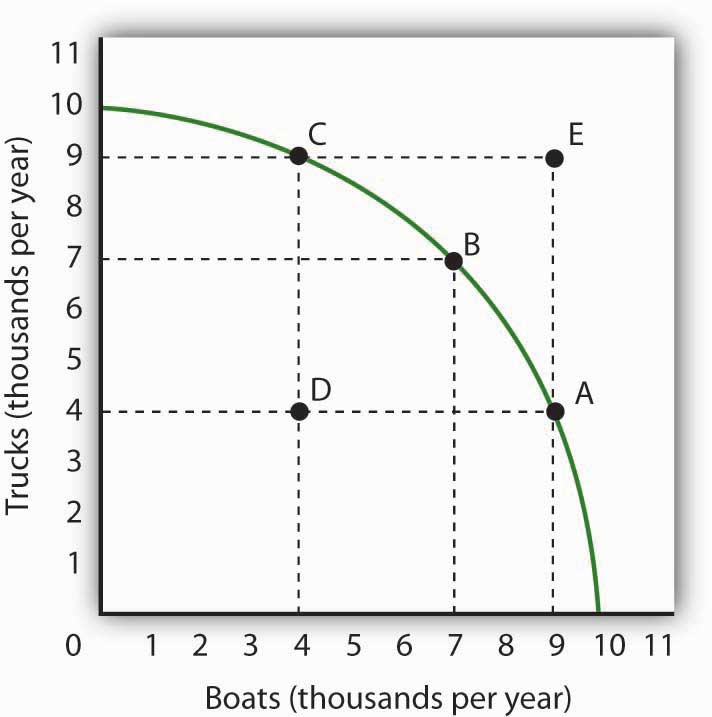Figure 17.1 "Roadway’s Production Possibilities Curve" shows a production possibilities curve for Roadway. We assume that it produces only two goods—trucks and boats. Roadway must be operating somewhere on its production possibilities curve or it will be wasting resources or engaging in inefficient production. If it were operating inside the curve at a point such as D, then a combination on the curve, such as B, would provide more of both goods (Roadway produces 3,000 more trucks and 3,000 more boats per year at B than at D). At any point inside the curve, Roadway’s production would not be efficient. Point E suggests an even higher level of output than points A, B, or C, but because point E lies outside Roadway’s production possibilities curve, it cannot be attained.