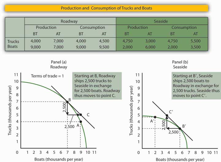 Roadway’s manufacturers will move to produce more trucks and fewer boats until they reach the point on their production possibilities curve at which the terms of trade equals the opportunity cost of producing trucks. That occurs at point B in Panel (a) of Figure 17.5 "International Trade Induces Greater Specialization"; Roadway now produces 7,000 trucks and 7,000 boats per year.