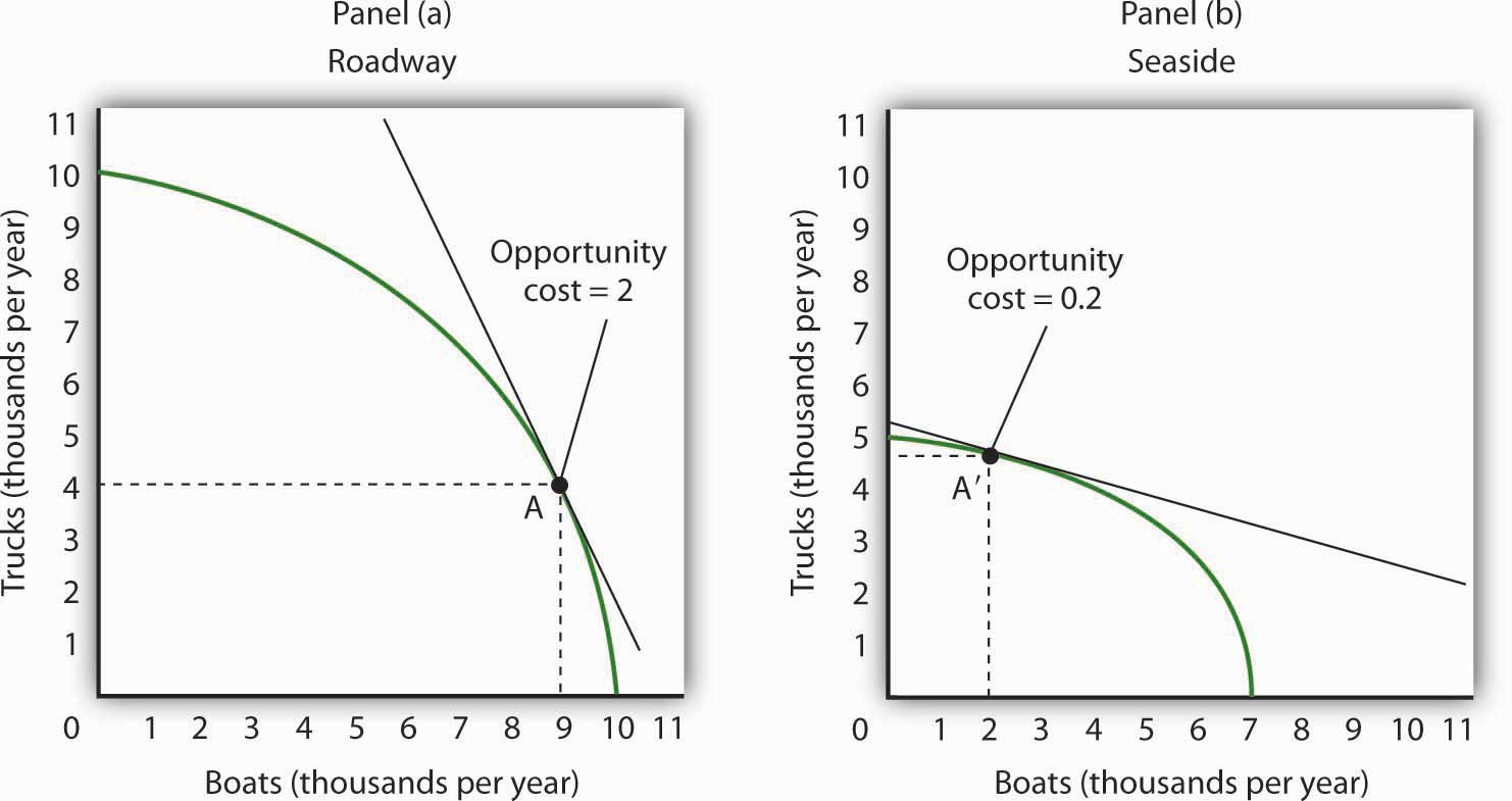 Each country produces two goods, boats and trucks. Suppose no trade occurs between the two countries and that they are each currently operating on their production possibilities curves at points A and A′ in Figure 17.3 "Comparative Advantage in Roadway and Seaside". We will assume that the two countries have chosen to operate at these points through the workings of demand and supply. That is, resources have been guided to their current uses as producers have responded to the demands of consumers in the two countries. In turn, consumers have responded to the prices charged by sellers of boats and trucks.