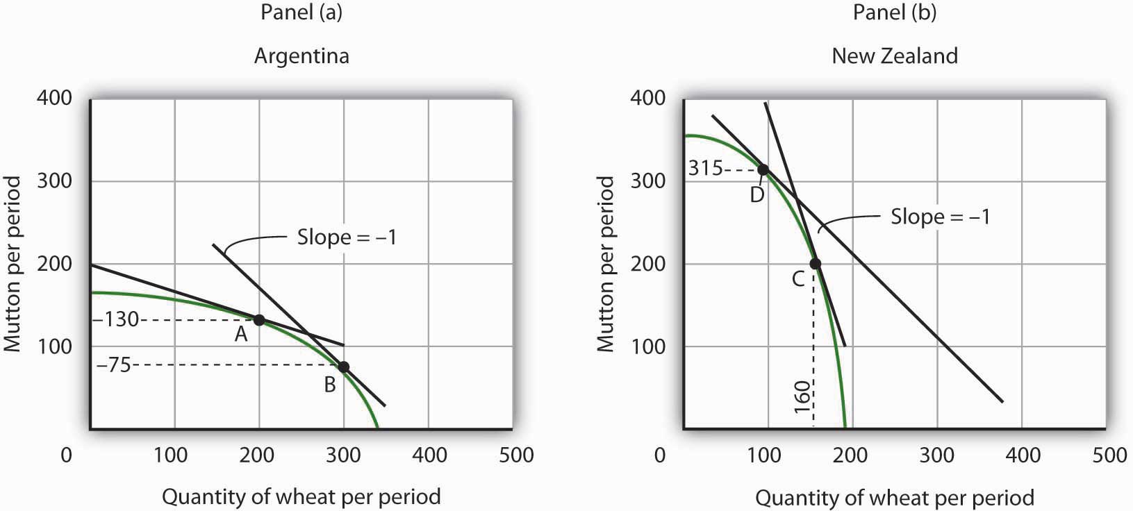 Argentina and New Zealand each produce wheat and mutton under conditions of perfect competition, as shown on the accompanying production possibilities curves. Assume that there is no trade between the two countries and that Argentina is now producing at point A and New Zealand at point C.