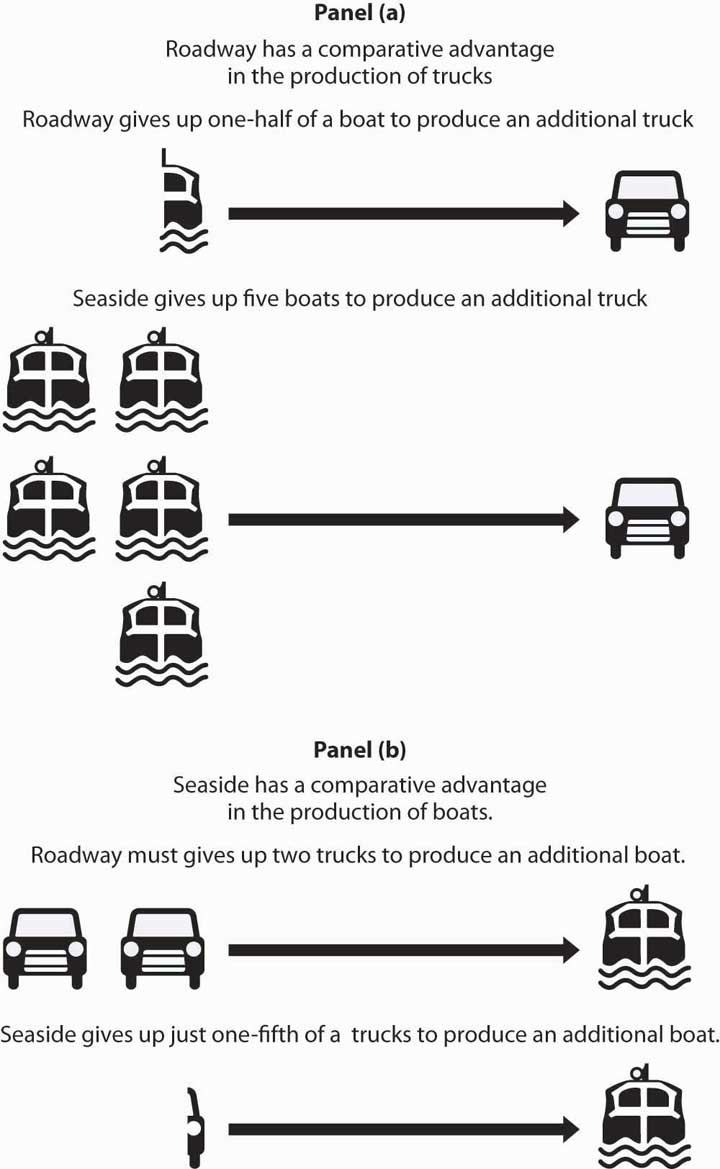 We can determine opportunity costs in the two countries by comparing the slopes of their respective production possibilities curves at the points where they are producing. At point A in Panel (a) of Figure 17.3 "Comparative Advantage in Roadway and Seaside", one additional boat costs two trucks in Roadway; that is its opportunity cost. At point A′ in Panel (b), 1 additional boat in Seaside costs only 0.2 truck. Alternatively, we can ask about the opportunity cost of an additional truck. In Roadway, an additional truck costs 0.5 boats. In Seaside, it costs five boats. Roadway thus has a comparative advantage in producing trucks; Seaside has a comparative advantage in producing boats. This situation is suggested pictorially in Figure 17.4 "A Picture of Comparative Advantage in Roadway and Seaside".