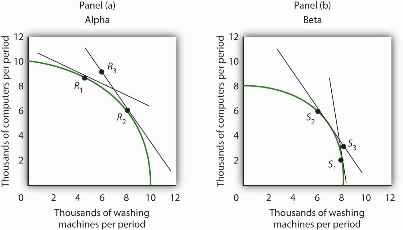 Here are sketches of possible production possibilities curves. Alpha is operating at a point such as R1, while Beta is operating at a point such as S1. In Alpha, 1 computer trades for 2 washing machines; in Beta, 3.5 computers trade for one washing machine. If trade opens between the two economies and the terms of trade are 1.5, then Alpha will produce more washing machines and fewer computers (moving to a point such as R2), while Beta will produce more computers and fewer washing machines (moving to a point such as S2). Though you were not asked to do this, the graphs demonstrate that it is possible that trade will result in both countries having more of both goods. If, for example, Alpha ships 2,000 washing machines to Beta in exchange for 3,000 computers, then the two economies will move to points R3 and S3, respectively, consuming more of both goods than they had before trade. There are many points along the tangent lines drawn at points R2 and S2 that are up to the right and therefore contain more of both goods. We have chosen points R3 and S3 at specific points, but any point along the tangent line that is up to the right from R1 and S1 would suffice to illustrate the fact that both countries can end up consuming more of both goods.