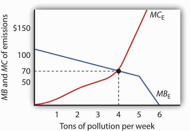 The efficient quantity of emissions is found at the intersection of the demand (DT) and marginal cost (MCT) curves in Panel (c) of Figure 18.1 "Determining the Efficient Level of Pollution", with 34 units of the pollutant emitted. The marginal benefit of the 34th unit of emissions, as measured by the demand curve DT, equals its marginal cost, MCT, at that level. The quantity at which the marginal benefit curve intersects the marginal cost curve maximizes the net benefit of an activity.