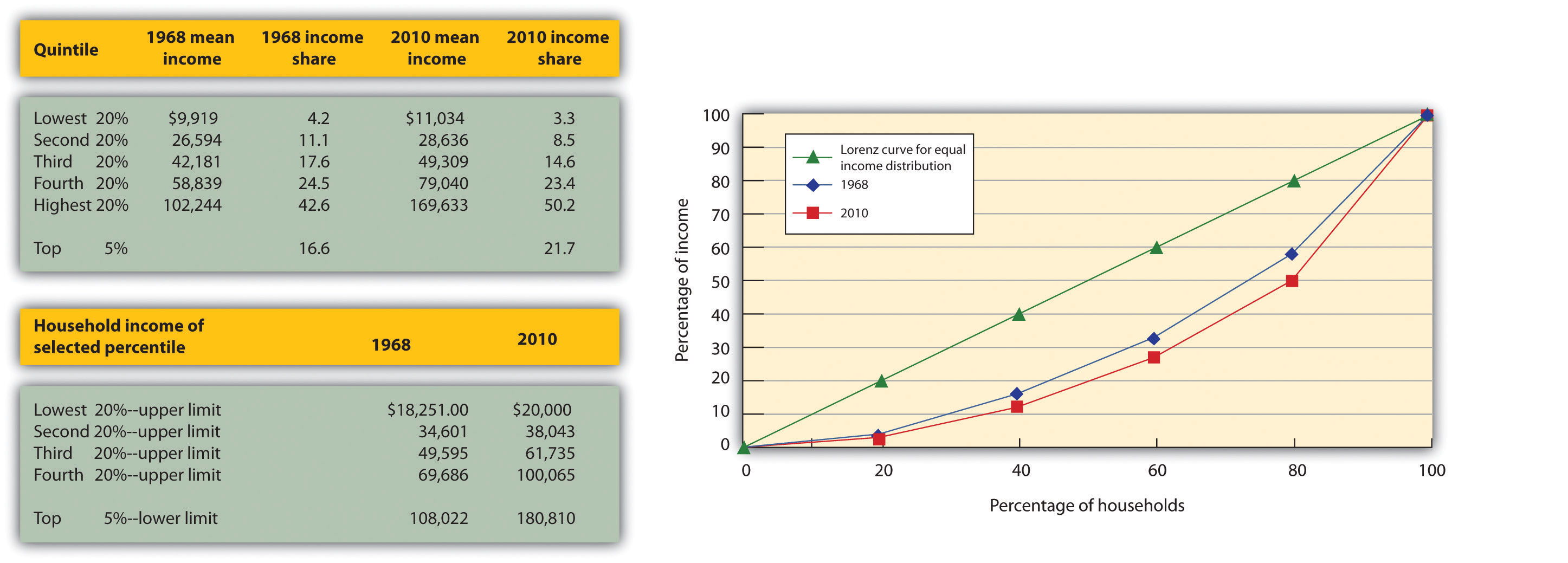 If every household in the United States received the same income, the Lorenz curve would coincide with the 45-degree line drawn in Figure 19.1 "The Distribution of U.S. Income, 1968 and 2010". The bottom 20% of households would receive 20% of income; the bottom 40% would receive 40%, and so on. If the distribution of income were completely unequal, with one household receiving all the income and the rest zero, then the Lorenz curve would be shaped like a backward L, with a horizontal line across the bottom of the graph at 0% income and a vertical line up the right-hand side. The vertical line would show, as always, that 100% of families still receive 100% of income. Actual Lorenz curves lie between these extremes. The closer a Lorenz curve lies to the 45-degree line, the more equal the distribution. The more bowed out the curve, the less equal the distribution. We see in Figure 19.1 "The Distribution of U.S. Income, 1968 and 2010" that the Lorenz curve for the United States became more bowed out between 1968 and 2010.