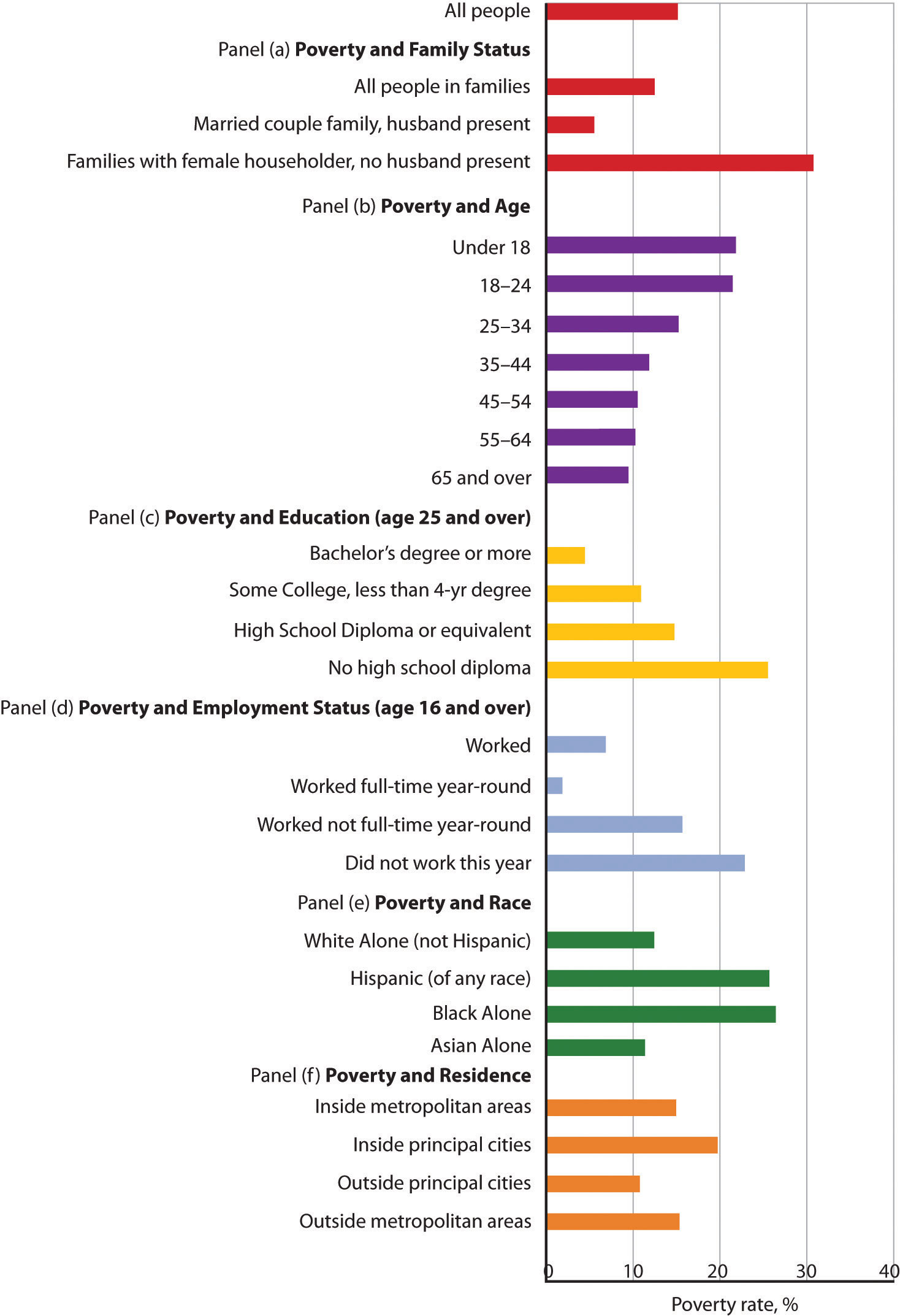 Poverty rates in the United States vary significantly according to a variety of demographic factors. Panels (a) through (f) compare poverty rates among different groups of the U.S. population. The data are for 2010.