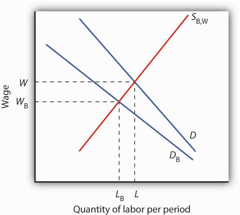 Looking at Figure 19.7 "Prejudice and Discrimination" suppose the wage that black workers are receiving in a discriminatory environment, WB, is $25 per hour, while the wage that white workers receive, W, is $30 per hour. Now suppose a regulation is imposed that requires that black workers be paid $30 per hour also.
