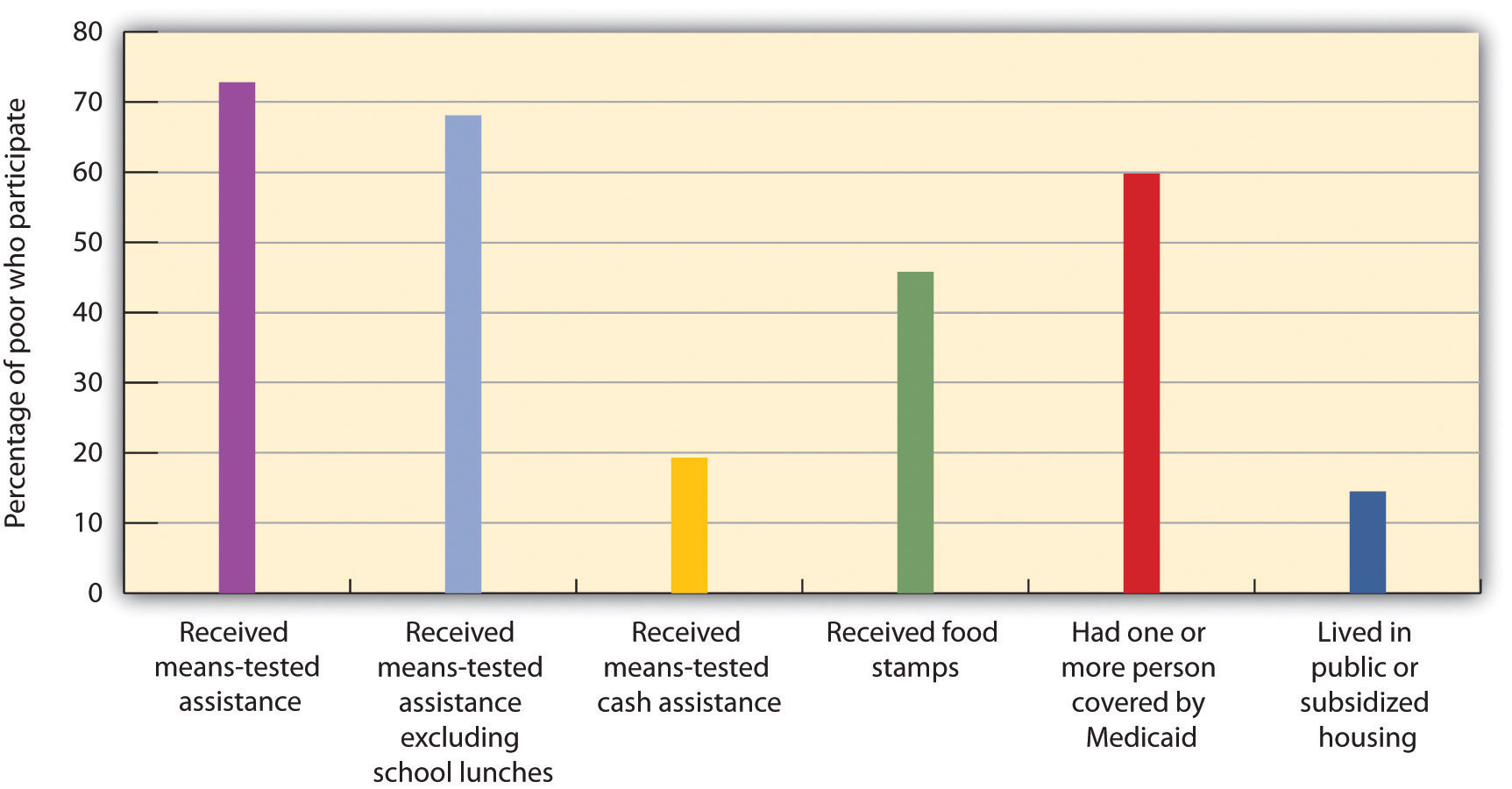 Not all people whose incomes fall below the poverty line received aid. In 2010, a substantial majority of those counted as poor received some form of aid. However, as shown in Figure 19.5 "Welfare Programs and the Poor", the percentages who were helped by individual programs were much lower. Less than 20% of people below the poverty line received some form of cash assistance in 2010. About 45% received food stamps and nearly 60% lived in a household in which one or more people received medical services through Medicaid. Only about one-seventh of the people living in poverty received some form of housing aid.
