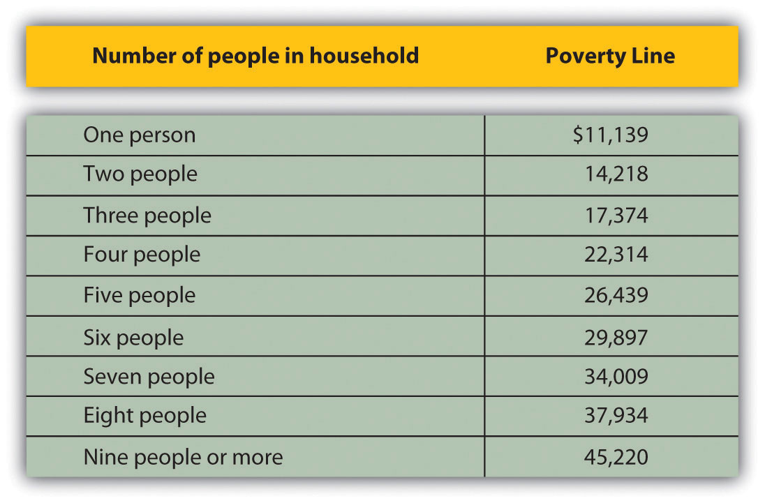In contrast, to determine who is poor according to the absolute income test, we define a specific level of income, independent of how many households fall above or below it. The federal government defines a household as poor if the household’s annual income falls below a dollar figure called the poverty lineAmount of annual income below which the federal government defines a household as poor.. In 2010 the poverty line for a family of four was an income of $22,314. Figure 19.2 "Weighted Average Poverty Thresholds in 2010, by Size of Family" shows the poverty line for various family sizes.