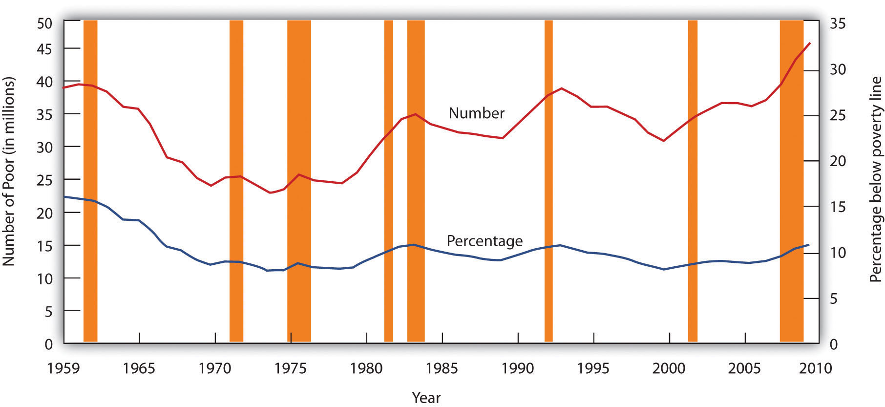 The percentage of the population that falls below the poverty line is called the poverty rateThe percentage of the population that falls below the poverty line.. Figure 19.3 "The Poverty Rate in the United States, 1959–2010" shows both the number of people and the percentage of the population that fell below the poverty line each year since 1959.