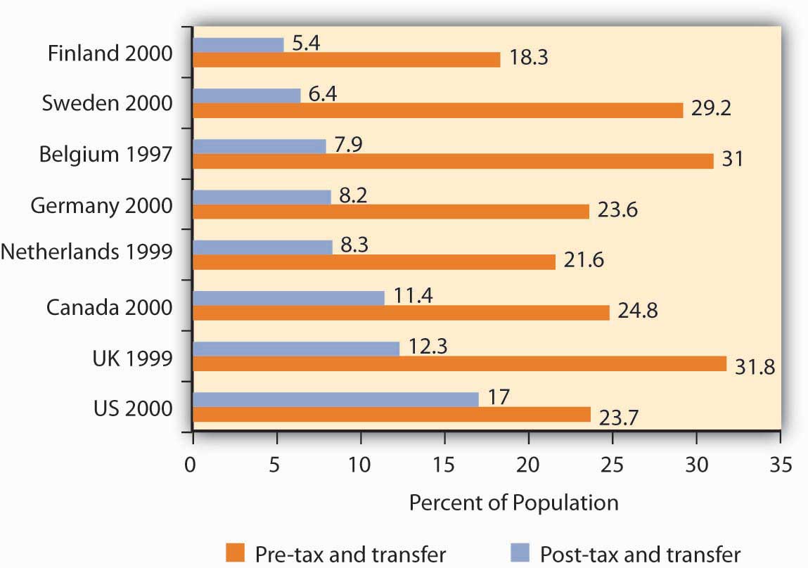 Taken together, though, transfer payment and tax programs in the United States are less effective in reducing poverty than are the programs of other developed countries. Figure 19.6 "Percentages of Population in Eight Countries with Disposable Incomes Less Than 1/2 the National Median" shows the percentage of the population in eight developed countries with a disposable income (income after taxes) less than one-half the national median. The figure shows this percentage both before and after tax and transfer payment programs are considered. Clearly, the United States is the least aggressive in seeking to eliminate poverty among the eight countries shown.