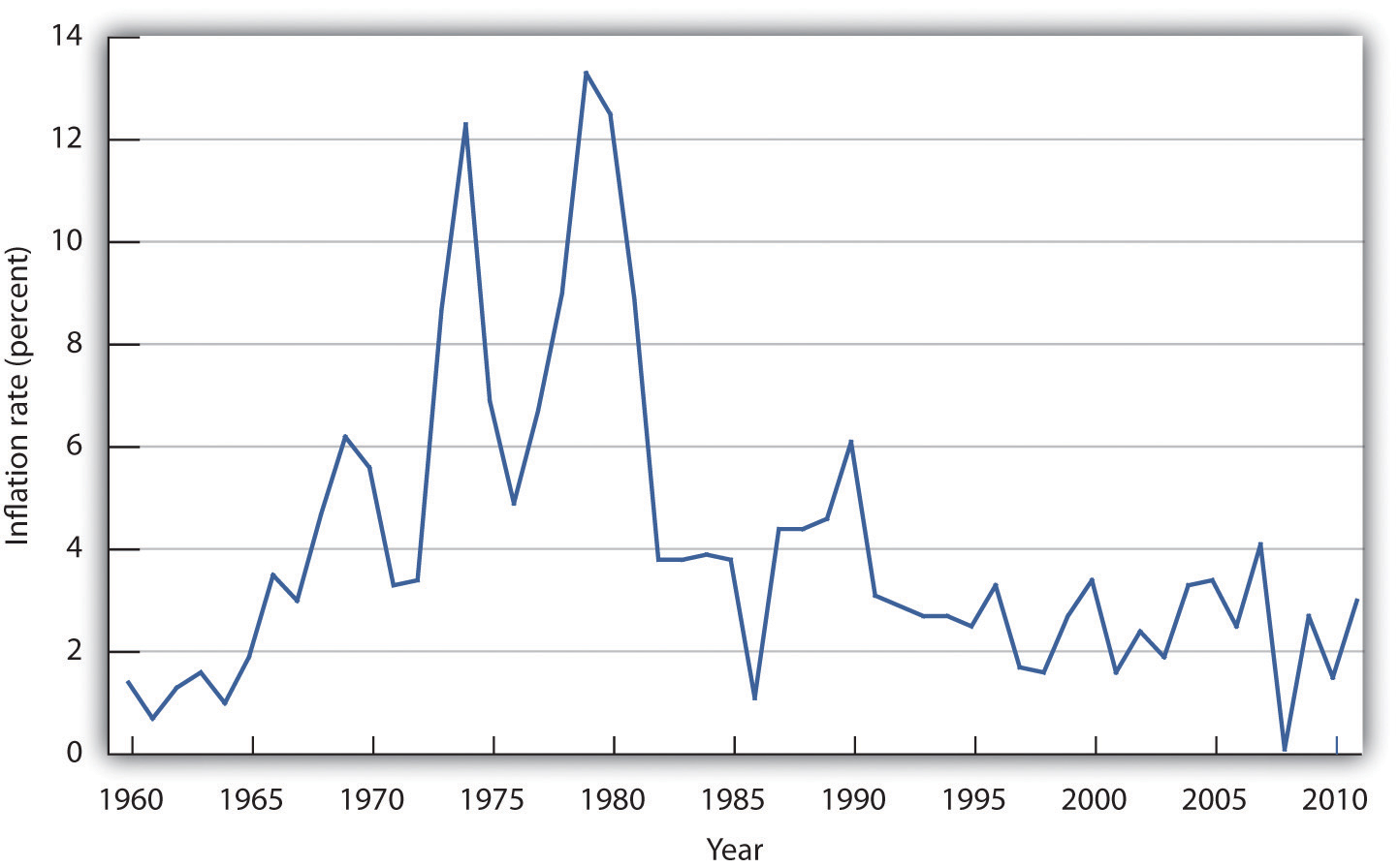Inflation is measured as the annual rate of increase in the average level of prices. Figure 20.3 "Inflation, 1960–2011" shows how volatile inflation has been in the United States over the past four decades. In the 1960s the inflation rate rose, and it became dramatically worse in the 1970s. The inflation rate plunged in the 1980s and continued to ease downward in the 1990s. It remained low in the early 2000s, began to accelerate in 2007, and has remained low since then.