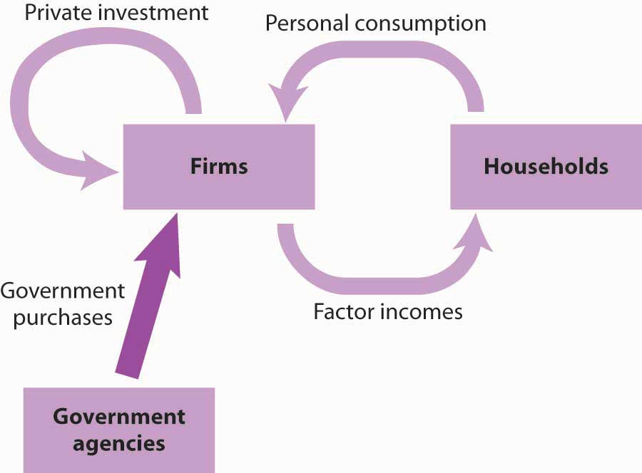 Government purchases represent a demand placed on firms, represented by the flow shown in Figure 21.3 "Government Purchases in the Circular Flow". Like all the components of GDP, the production of goods and services for government agencies creates factor incomes for households.