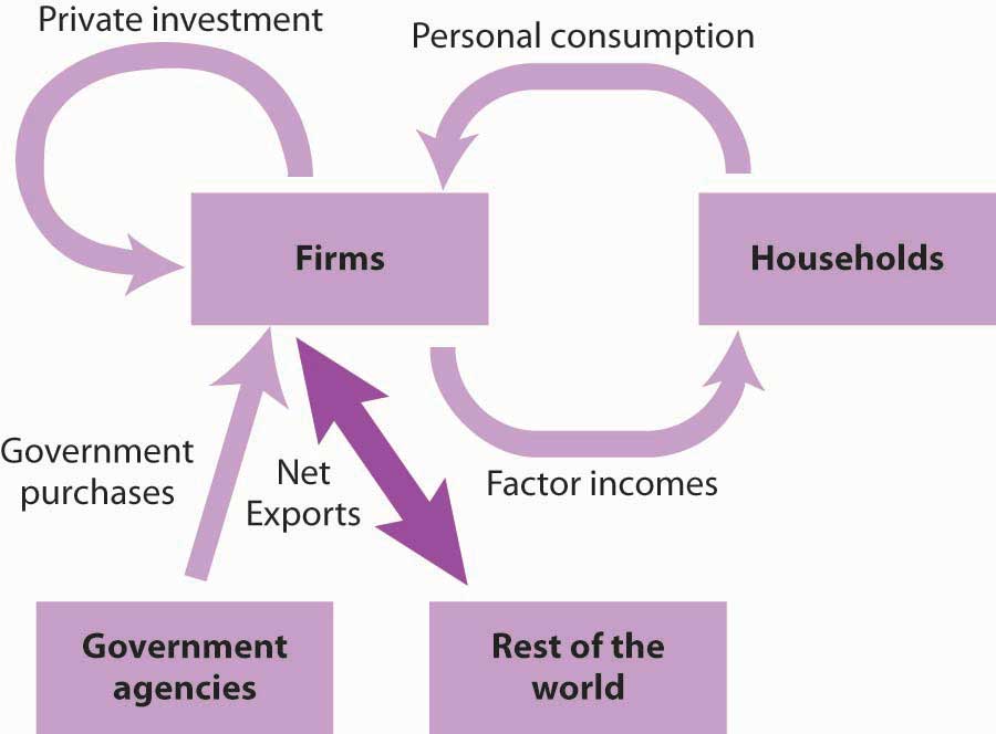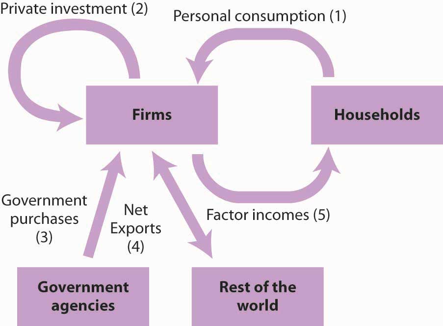 The production of goods and services for personal consumption, private investment, government purchases, and net exports makes up a nation’s GDP. Firms produce these goods and services in response to demands from households (personal consumption), from other firms (private investment), from government agencies (government purchases), and from the rest of the world (net exports). All of this production creates factor income for households. Figure 21.5 "Spending in the Circular Flow Model" shows the circular flow model for all the spending flows we have discussed. Each flow is numbered for use in the exercise at the end of this section.