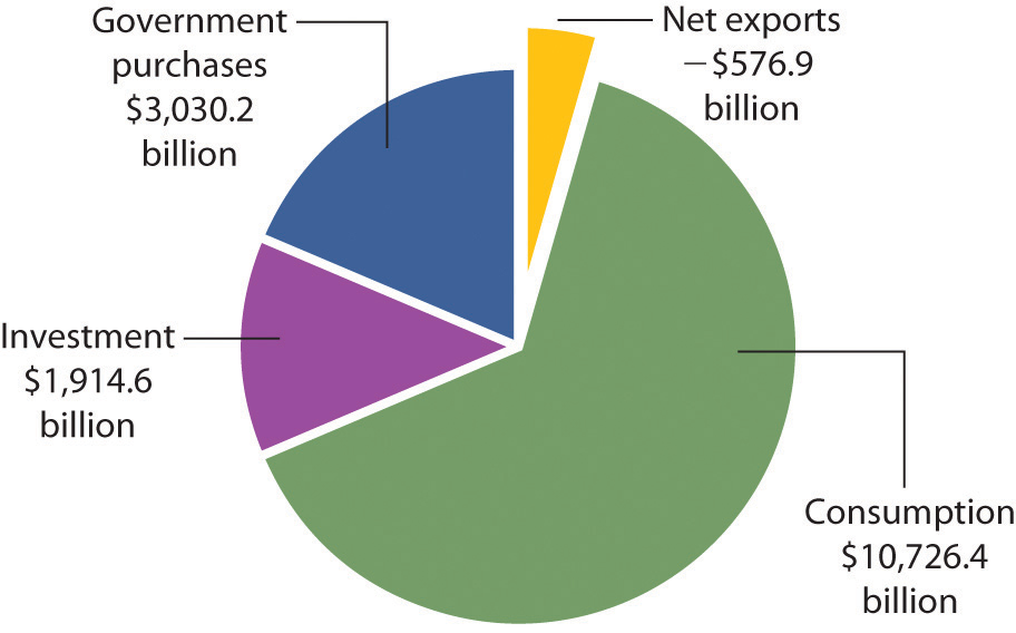 Figure 21.6 "Components of GDP, 2011 in Billions of Dollars" shows the size of the components of GDP in 2011. We see that the production of goods and services for personal consumption accounted for about 70% of GDP. Imports exceeded exports, so net exports were negative.