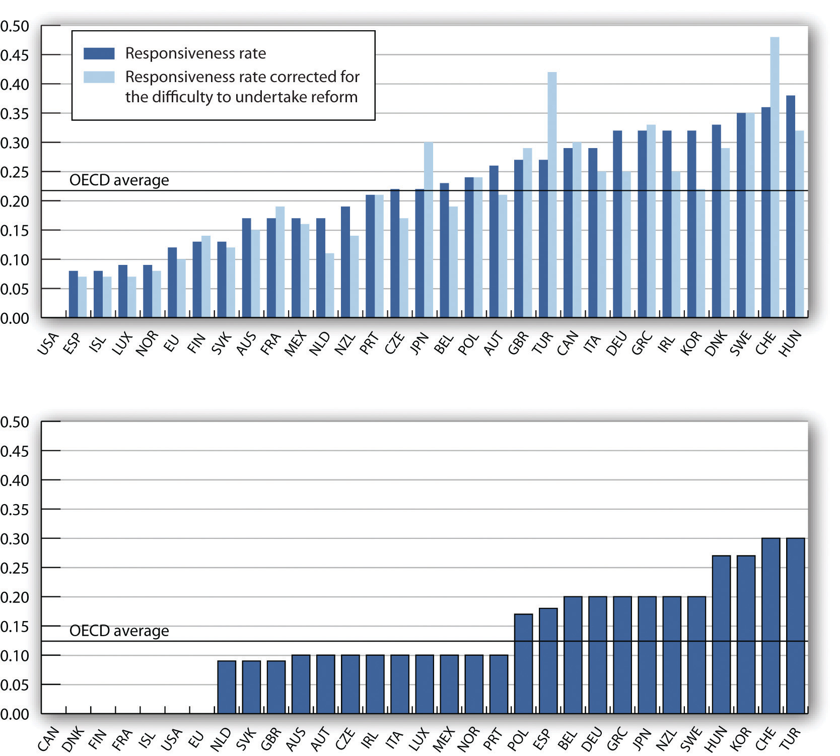 As we can see, the responsiveness and follow-through rates vary widely. Turkey and the Czech Republic stand out as the countries having undertaken substantial reform. The United States stands out as the country having shown neither responsiveness nor follow-through. While the relatively strong performance of the United States at the end of the 20th century, as shown in Table 23.1 "Growing Disparities in Rates of Economic Growth", could indicate relatively less need for growth-enhancing reforms, the comparative lack of progress since 2005 raises doubt concerning the ability to maintain strong economic growth going forward.