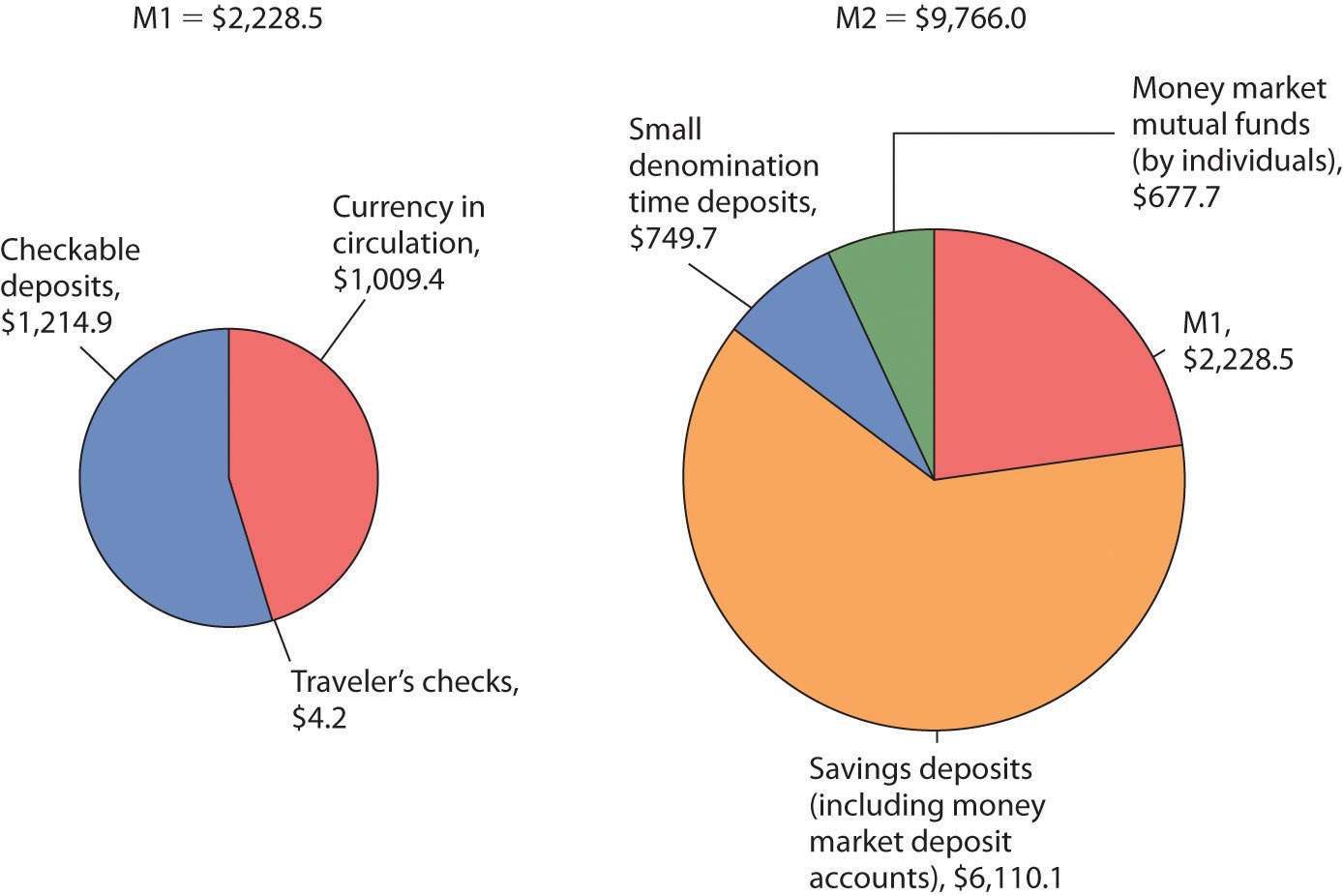 M1The narrowest of the Fed’s money supply definitions that includes currency in circulation, checkable deposits, and traveler’s checks. is the narrowest of the Fed’s money supply definitions. It includes currency in circulation, checkable deposits, and traveler’s checks. M2A broader measure of the money supply than M1 that includes M1 and other deposits. is a broader measure of the money supply than M1. It includes M1 and other deposits such as small savings accounts (less than $100,000), as well as accounts such as money market mutual funds (MMMFs) that place limits on the number or the amounts of the checks that can be written in a certain period.