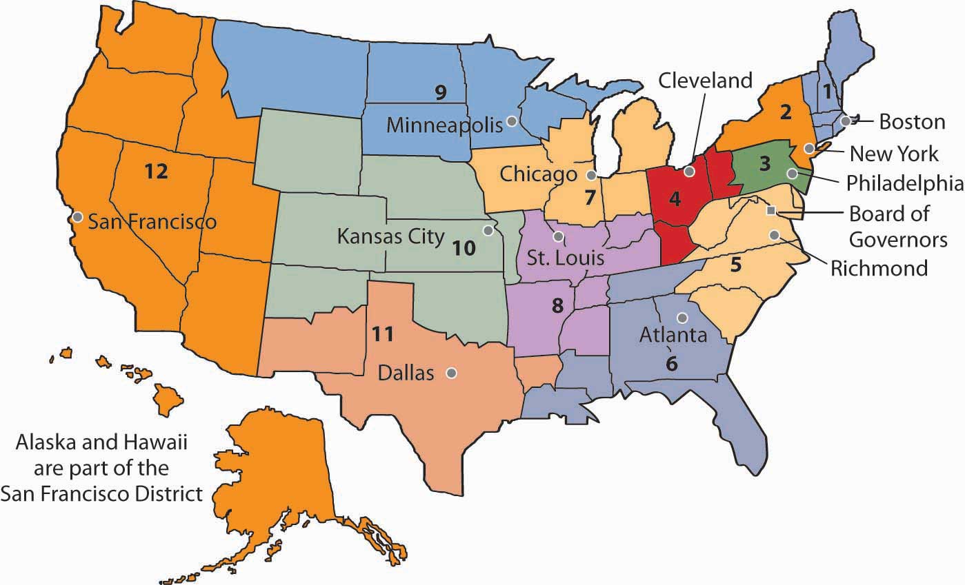 In an effort to decentralize power, Congress designed the Fed as a system of 12 regional banks, as shown in Figure 24.8 "The 12 Federal Reserve Districts and the Cities Where Each Bank Is Located". Each of these banks operates as a kind of bankers’ cooperative; the regional banks are owned by the commercial banks in their districts that have chosen to be members of the Fed. The owners of each Federal Reserve bank select the board of directors of that bank; the board selects the bank’s president.