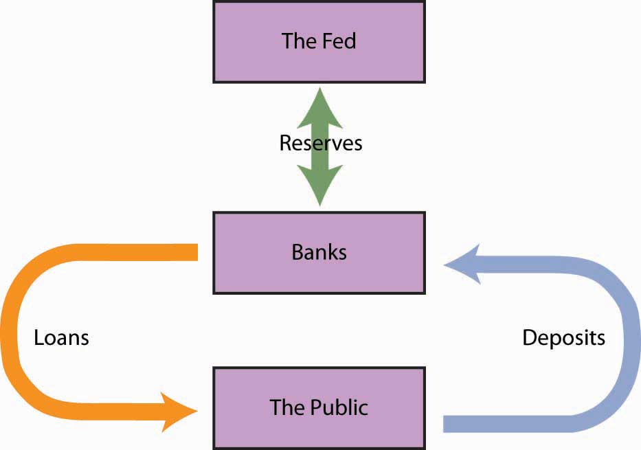 Individuals and firms (the public) make deposits in banks; banks make loans to individuals and firms. The Fed can buy bonds to inject new reserves into the system, thus increasing bank lending, which creates new deposits, creating still more lending as the deposit multiplier goes to work. Alternatively, the Fed can sell bonds, withdrawing reserves from the system, thus reducing bank lending and reducing total deposits.