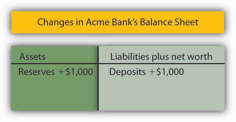 The Fed’s purchase of a bond can be illustrated using a balance sheet. Suppose the Fed buys a bond for $1,000 from one of Acme Bank’s customers. When that customer deposits the check at Acme, checkable deposits will rise by $1,000. The check is written on the Federal Reserve System; the Fed will credit Acme’s account. Acme’s reserves thus rise by $1,000. With a 10% reserve requirement, that will create $900 in excess reserves and set off the same process of money expansion as did the cash deposit we have already examined. The difference is that the Fed’s purchase of a bond created new reserves with the stroke of a pen, where the cash deposit created them by removing $1,000 from currency in circulation. The purchase of the $1,000 bond by the Fed could thus increase the money supply by as much as $10,000, the maximum expansion suggested by the deposit multiplier.