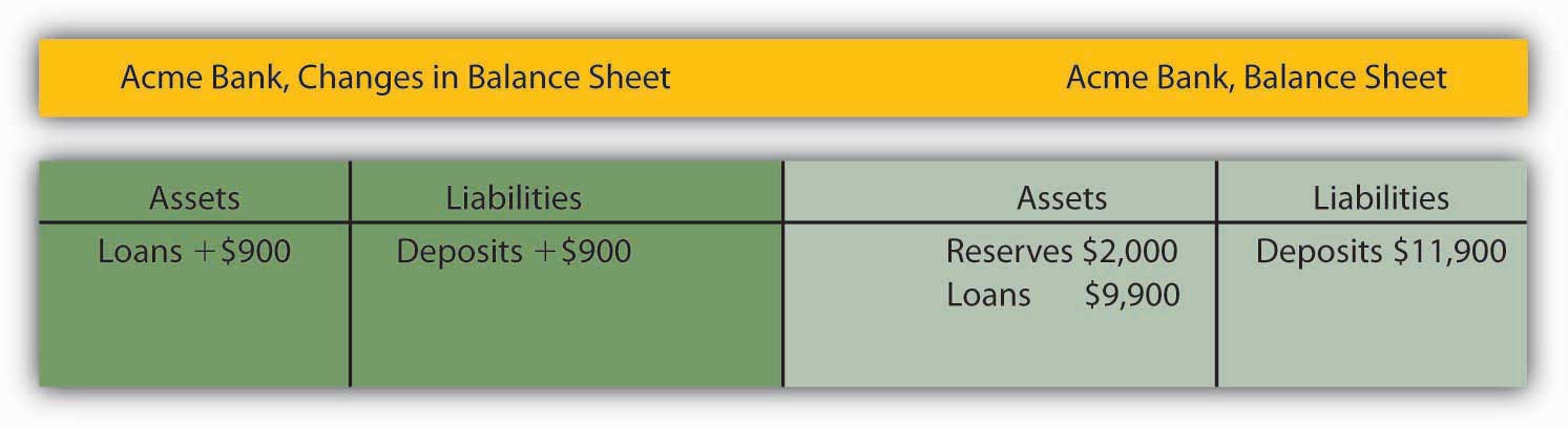 Because Acme earns only a low interest rate on its excess reserves, we assume it will try to loan them out. Suppose Acme lends the $900 to one of its customers. It will make the loan by crediting the customer’s checking account with $900. Acme’s outstanding loans and checkable deposits rise by $900. The $900 in checkable deposits is new money; Acme created it when it issued the $900 loan. Now you know where money comes from—it is created when a bank issues a loan.
