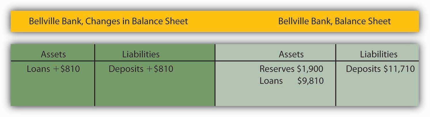 The process of money creation will not end there. Let us go back to Bellville Bank. Its deposits and reserves rose by $900 when the Acme check was deposited in a Bellville account. The $900 deposit required an increase in required reserves of $90. Because Bellville’s reserves rose by $900, it now has $810 in excess reserves. Just as Acme lent the amount of its excess reserves, we can expect Bellville to lend this $810. The next set of balance sheets shows this transaction. Bellville’s loans and checkable deposits rise by $810.