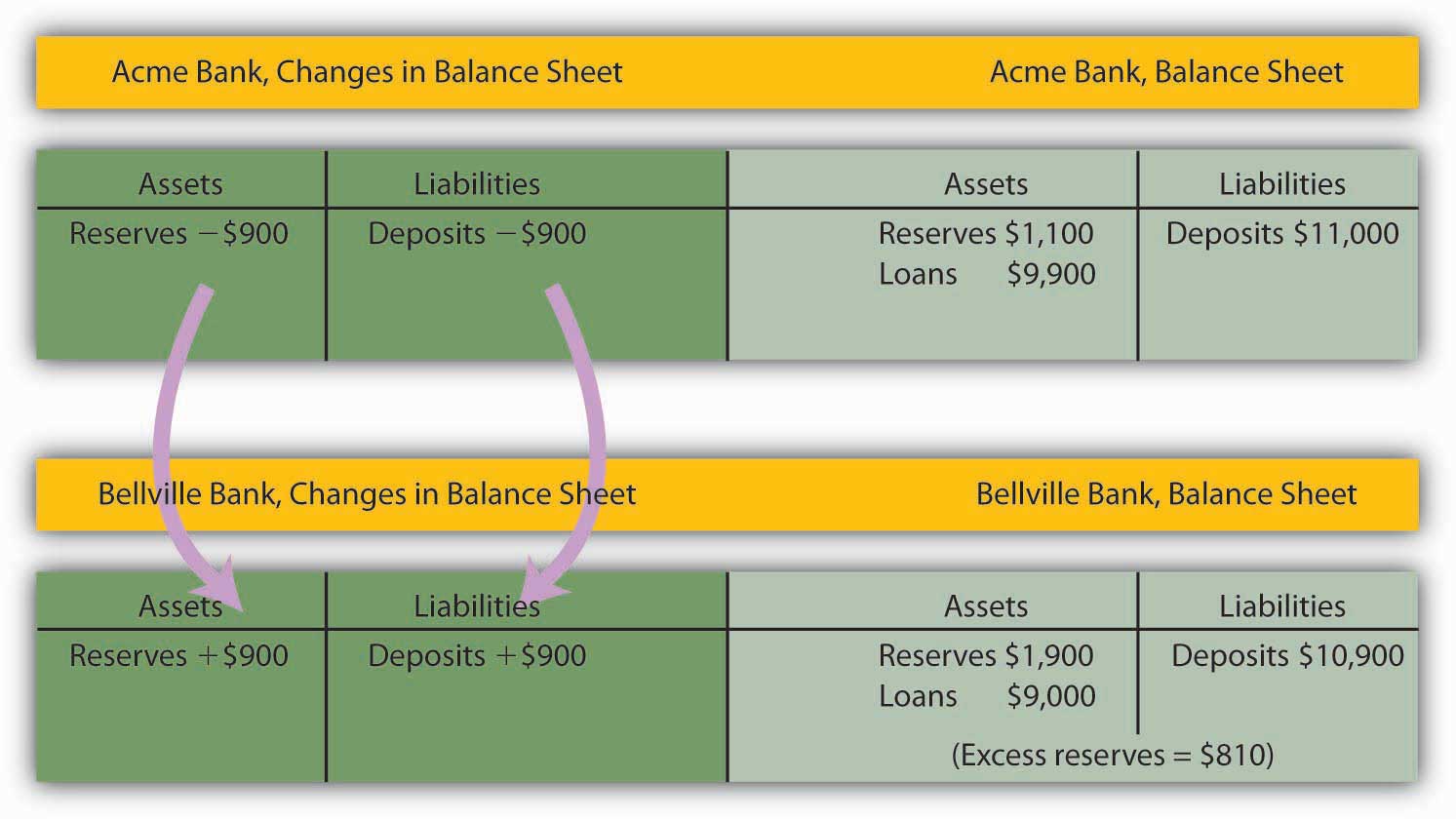 Presumably, the customer who borrowed the $900 did so in order to spend it. That customer will write a check to someone else, who is likely to bank at some other bank. Suppose that Acme’s borrower writes a check to a firm with an account at Bellville Bank. In this set of transactions, Acme’s checkable deposits fall by $900. The firm that receives the check deposits it in its account at Bellville Bank, increasing that bank’s checkable deposits by $900. Bellville Bank now has a check written on an Acme account. Bellville will submit the check to the Fed, which will reduce Acme’s deposits with the Fed—its reserves—by $900 and increase Bellville’s reserves by $900.