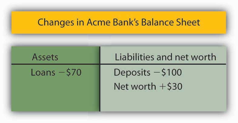 Suppose, for example, that the Acme Bank customer who borrowed the $900 makes a $100 payment on the loan. Only part of the payment will reduce the loan balance; part will be interest. Suppose $30 of the payment is for interest, while the remaining $70 reduces the loan balance. The effect of the payment on Acme’s balance sheet is shown below. Checkable deposits fall by $100, loans fall by $70, and net worth rises by the amount of the interest payment, $30.