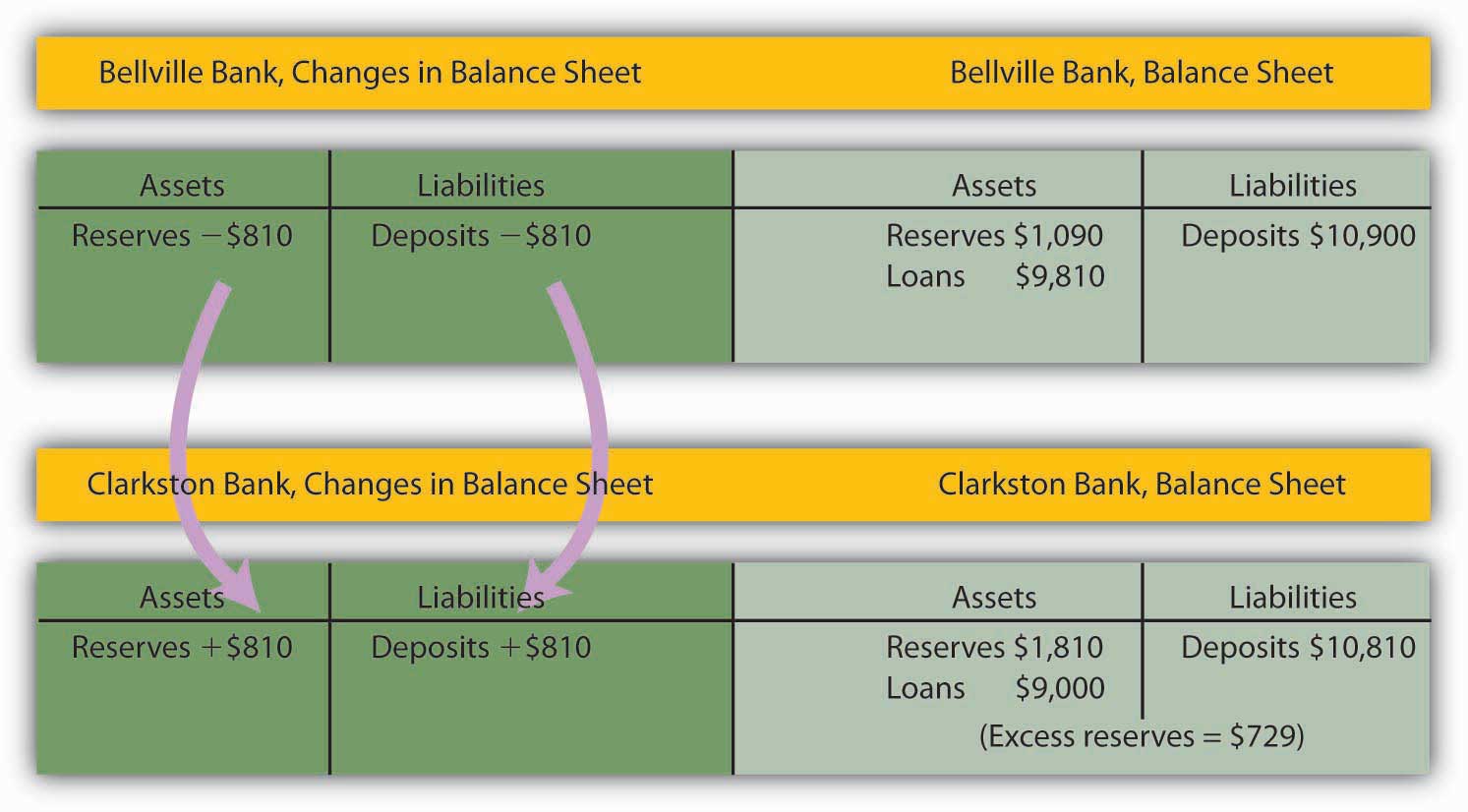 The $810 that Bellville lent will be spent. Let us suppose it ends up with a customer who banks at Clarkston Bank. Bellville’s checkable deposits fall by $810; Clarkston’s rise by the same amount. Clarkston submits the check to the Fed, which transfers the money from Bellville’s reserve account to Clarkston’s. Notice that Clarkston’s deposits rise by $810; Clarkston must increase its reserves by $81. But its reserves have risen by $810, so it has excess reserves of $729.