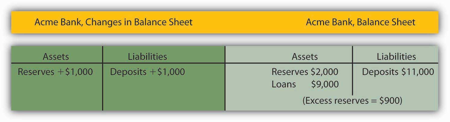 Let us suppose that every bank in our imaginary system begins with $1,000 in reserves, $9,000 in loans outstanding, and $10,000 in checkable deposit balances held by customers. The balance sheet for one of these banks, Acme Bank, is shown in Table 24.2 "A Balance Sheet for Acme Bank". The required reserve ratio is 0.1: Each bank must have reserves equal to 10% of its checkable deposits. Because reserves equal required reserves, excess reserves equal zero. Each bank is loaned up.
