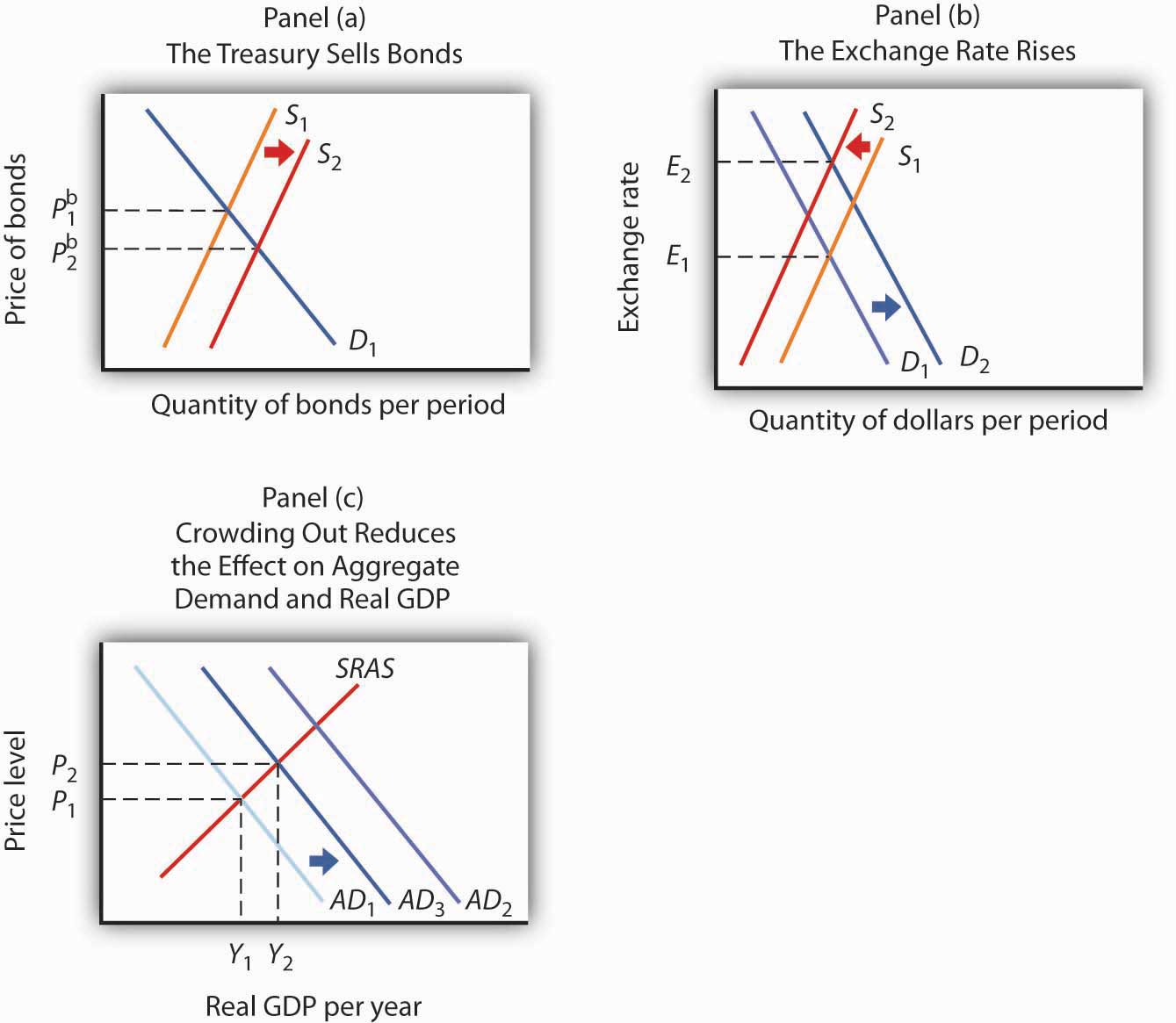 Figure 27.10 "An Expansionary Fiscal Policy and Crowding Out" shows the impact of an expansionary fiscal policy: an increase in government purchases. The increase in government purchases increases the deficit or reduces the surplus. In either case, the Treasury will sell more bonds than it would have otherwise, shifting the supply curve for bonds to the right in Panel (a). That reduces the price of bonds, raising the interest rate. The increase in the interest rate reduces the quantity of private investment demanded. The higher interest rate increases the demand for and reduces the supply of dollars in the foreign exchange market, raising the exchange rate in Panel (b). A higher exchange rate reduces net exports. Panel (c) shows the effects of all these changes on the aggregate demand curve. Before the change in government purchases, the economy is in equilibrium at a real GDP of Y1, determined by the intersection of AD1 and the short-run aggregate supply curve. The increase in government expenditures would shift the curve outward to AD2 if there were no adverse impact on investment and net exports. But the reduction in investment and net exports partially offsets this increase. Taking the reduction in investment and net exports into account means that the aggregate demand curve shifts only to AD3. The tendency for an expansionary fiscal policy to reduce other components of aggregate demand is called crowding outThe tendency for an expansionary fiscal policy to reduce other components of aggregate demand.. In the short run, this policy leads to an increase in real GDP to Y2 and a higher price level, P2.