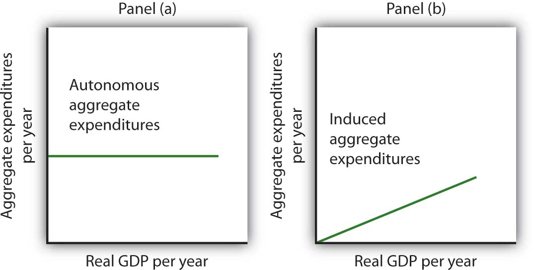 Autonomous aggregate expenditures do not vary with the level of real GDP; induced aggregate expenditures do. Autonomous aggregate expenditures are shown by the horizontal line in Panel (a). Induced aggregate expenditures vary with real GDP, as in Panel (b).