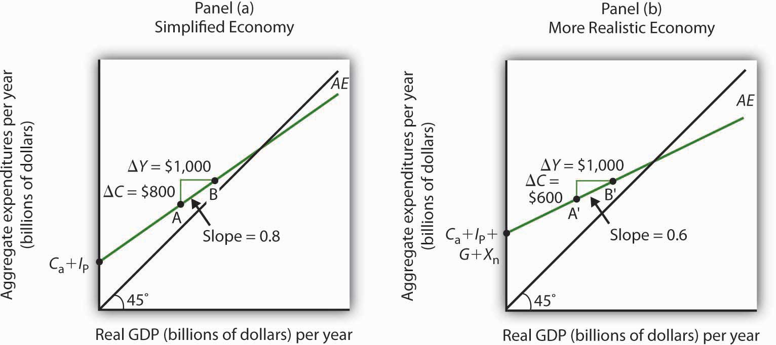Second, notice that the slope of the aggregate expenditures curve is flatter for the more realistic economy in Panel (b) than it is for the simplified economy in Panel (a). This can be seen by comparing the slope of the aggregate expenditures curve between points A and B in Panel (a) to the slope of the aggregate expenditures curve between points A′ and B′ in Panel (b). Between both sets of points, real GDP changes by the same amount, $1,000 billion. In Panel (a), consumption rises by $800 billion, whereas in Panel (b) consumption rises by only $600 billion. This difference occurs because, in the more realistic view of the economy, households have only a fraction of real GDP available as disposable personal income. Thus, for a given change in real GDP, consumption rises by a smaller amount.