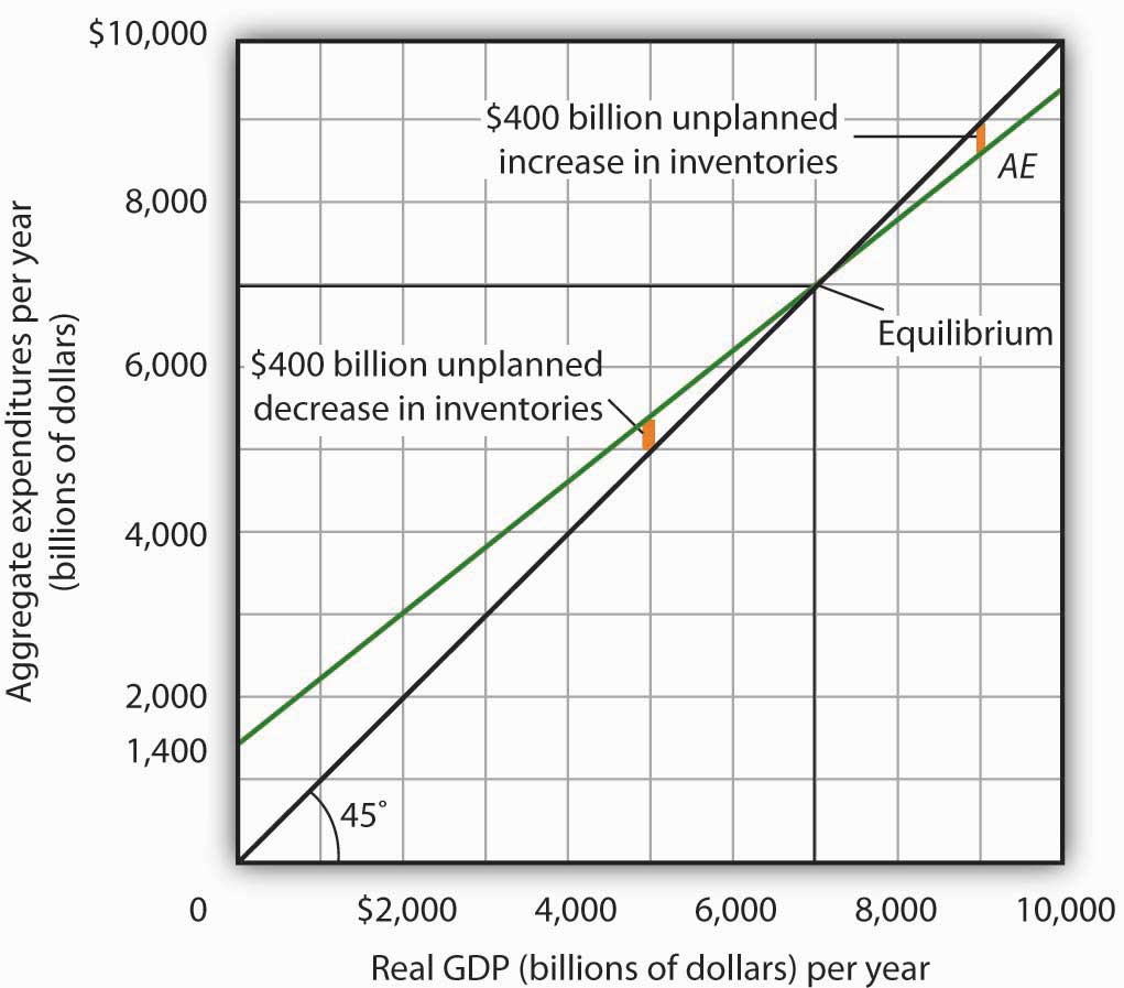If firms were to produce a real GDP greater than $7,000 billion per year, aggregate expenditures would fall short of real GDP. At a level of real GDP of $9,000 billion per year, for example, aggregate expenditures equal $8,600 billion. Firms would be left with $400 billion worth of goods they intended to sell but did not. Their actual level of investment would be $400 billion greater than their planned level of investment. With those unsold goods on hand (that is, with an unplanned increase in inventories), firms would be likely to cut their output, moving the economy toward its equilibrium GDP of $7,000 billion. If firms were to produce $5,000 billion, aggregate expenditures would be $5,400 billion. Consumers and firms would demand more than was produced; firms would respond by reducing their inventories below the planned level (that is, there would be an unplanned decrease in inventories) and increasing their output in subsequent periods, again moving the economy toward its equilibrium real GDP of $7,000 billion. Figure 28.9 "Adjusting to Equilibrium Real GDP" shows possible levels of real GDP in the economy for the aggregate expenditures function illustrated in Figure 28.8 "Determining Equilibrium in the Aggregate Expenditures Model". It shows the level of aggregate expenditures at various levels of real GDP and the direction in which real GDP will change whenever AE does not equal real GDP. At any level of real GDP other than the equilibrium level, there is unplanned investment.