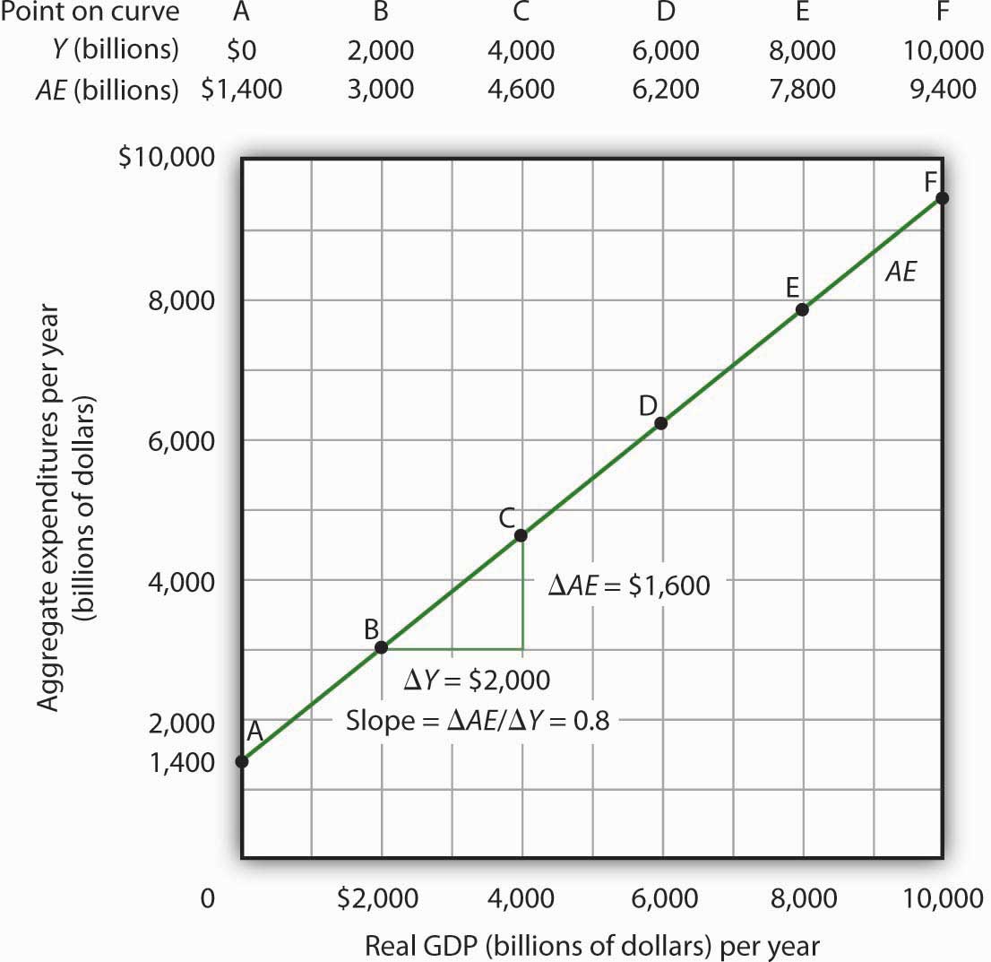 The slope of the aggregate expenditures curve, given by the change in aggregate expenditures divided by the change in real GDP between any two points, measures the additional expenditures induced by increases in real GDP. The slope for the aggregate expenditures curve in Figure 28.7 "Plotting the Aggregate Expenditures Curve" is shown for points B and C: it is 0.8.