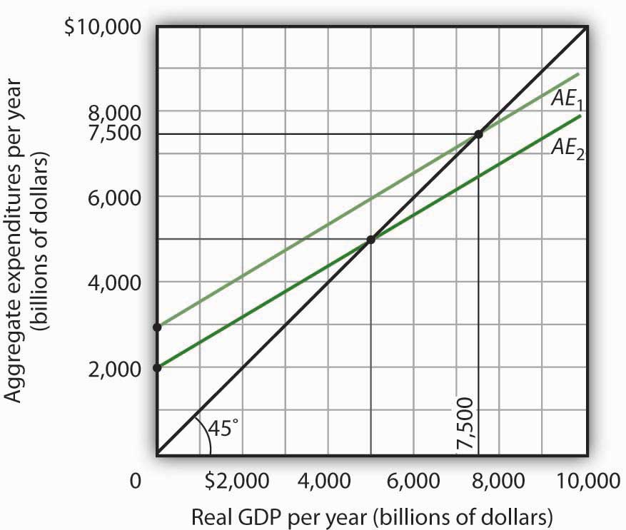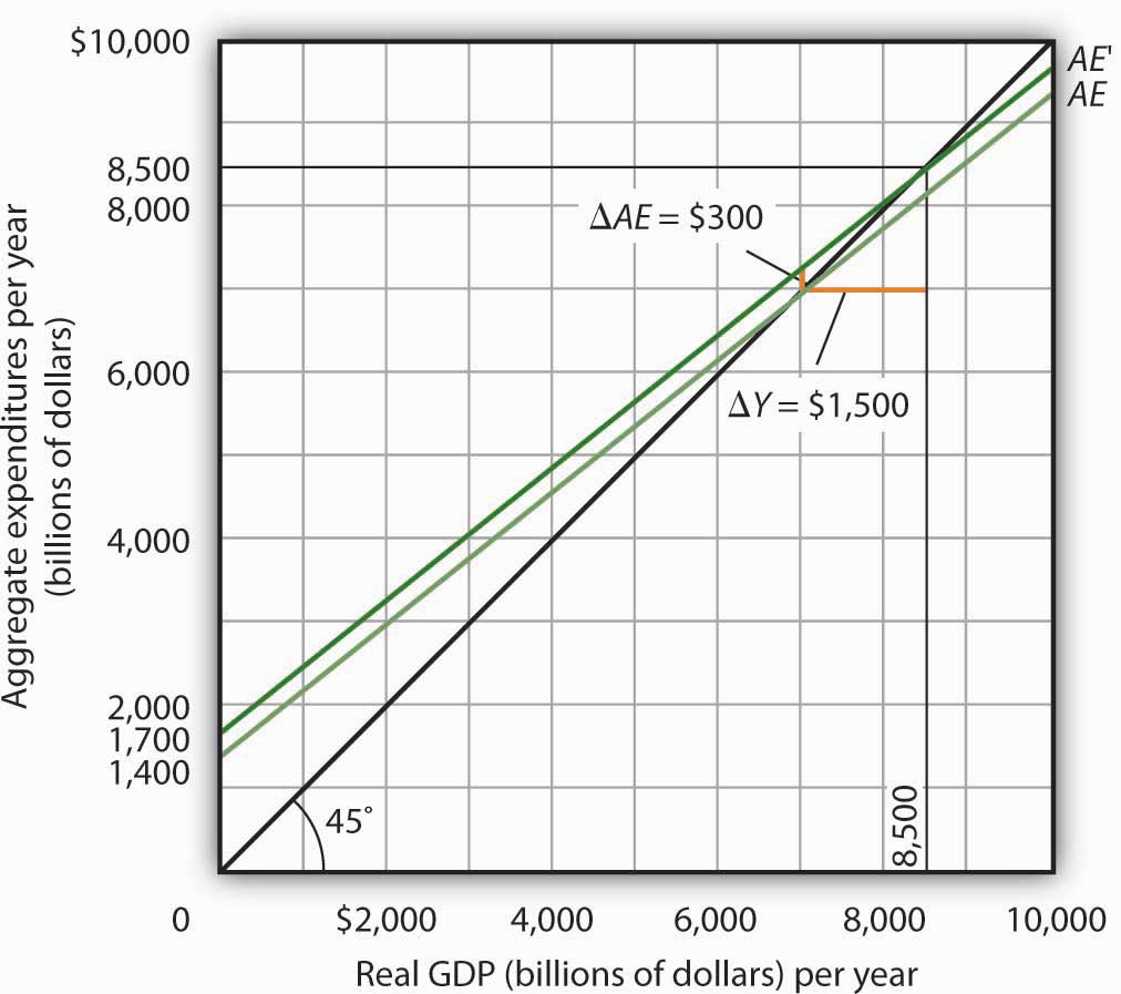 Figure 28.10 "A Change in Autonomous Aggregate Expenditures Changes Equilibrium Real GDP" begins with the aggregate expenditures curve shown in Figure 28.8 "Determining Equilibrium in the Aggregate Expenditures Model". Now suppose that planned investment increases from the original value of $1,100 billion to a new value of $1,400 billion—an increase of $300 billion. This increase in planned investment shifts the aggregate expenditures curve upward by $300 billion, all other things unchanged. Notice, however, that the new aggregate expenditures curve intersects the 45-degree line at a real GDP of $8,500 billion. The $300 billion increase in planned investment has produced an increase in equilibrium real GDP of $1,500 billion.