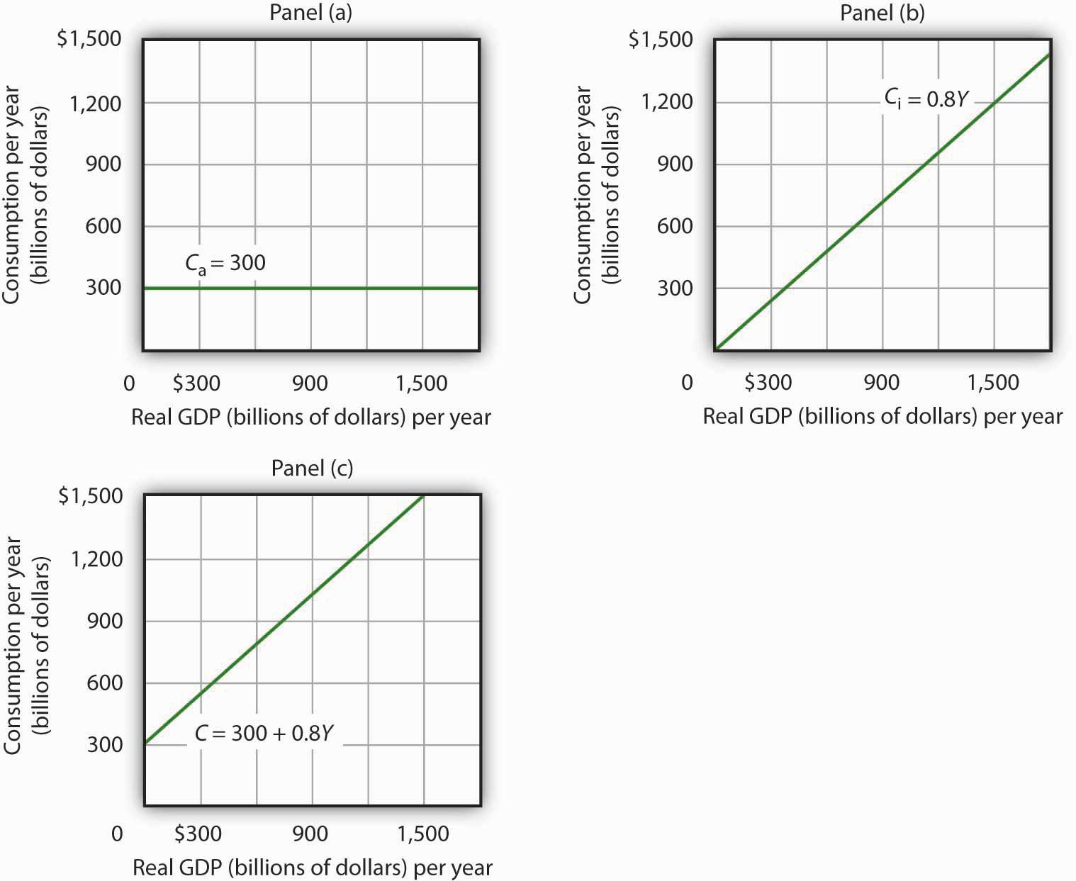 Figure 28.6 "Autonomous and Induced Consumption" illustrates these two components of consumption. Autonomous consumption, Ca, which is always $300 billion, is shown in Panel (a); its equation is