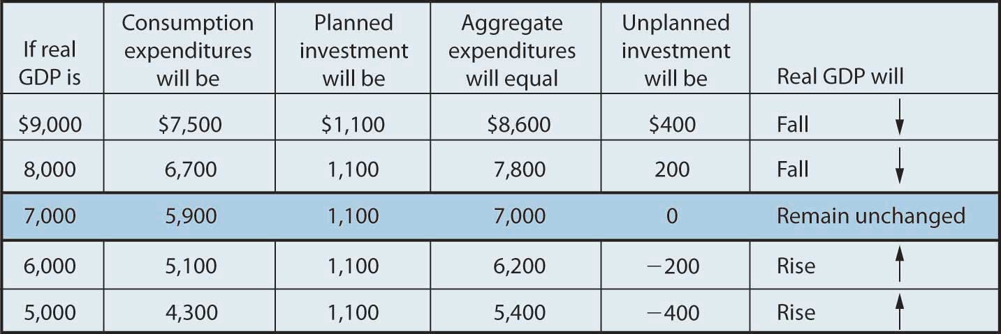 Each level of real GDP will result in a particular amount of aggregate expenditures. If aggregate expenditures are less than the level of real GDP, firms will reduce their output and real GDP will fall. If aggregate expenditures exceed real GDP, then firms will increase their output and real GDP will rise. If aggregate expenditures equal real GDP, then firms will leave their output unchanged; we have achieved equilibrium in the aggregate expenditures model. At equilibrium, there is no unplanned investment. Here, that occurs at a real GDP of $7,000 billion.
