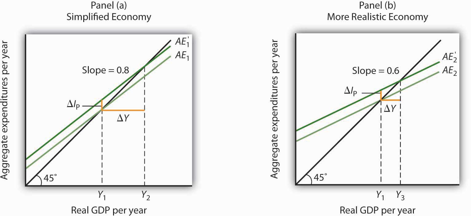 Let us examine what happens to equilibrium real GDP in each case if there is a shift in autonomous aggregate expenditures, such as an increase in planned investment, as shown in Figure 28.12 "A Change in Autonomous Aggregate Expenditures: Comparison of a Simplified Economy and a More Realistic Economy". In both panels, the initial level of equilibrium real GDP is the same, Y1. Equilibrium real GDP occurs where the given aggregate expenditures curve intersects the 45-degree line. The aggregate expenditures curve shifts up by the same amount—ΔA is the same in both panels. The new level of equilibrium real GDP occurs where the new AE curve intersects the 45-degree line. In Panel (a), we see that the new level of equilibrium real GDP rises to Y2, but in Panel (b) it rises only to Y3. Since the same change in autonomous aggregate expenditures led to a greater increase in equilibrium real GDP in Panel (a) than in Panel (b), the multiplier for the more realistic model of the economy must be smaller. The multiplier is smaller, of course, because the slope of the aggregate expenditures curve is flatter.