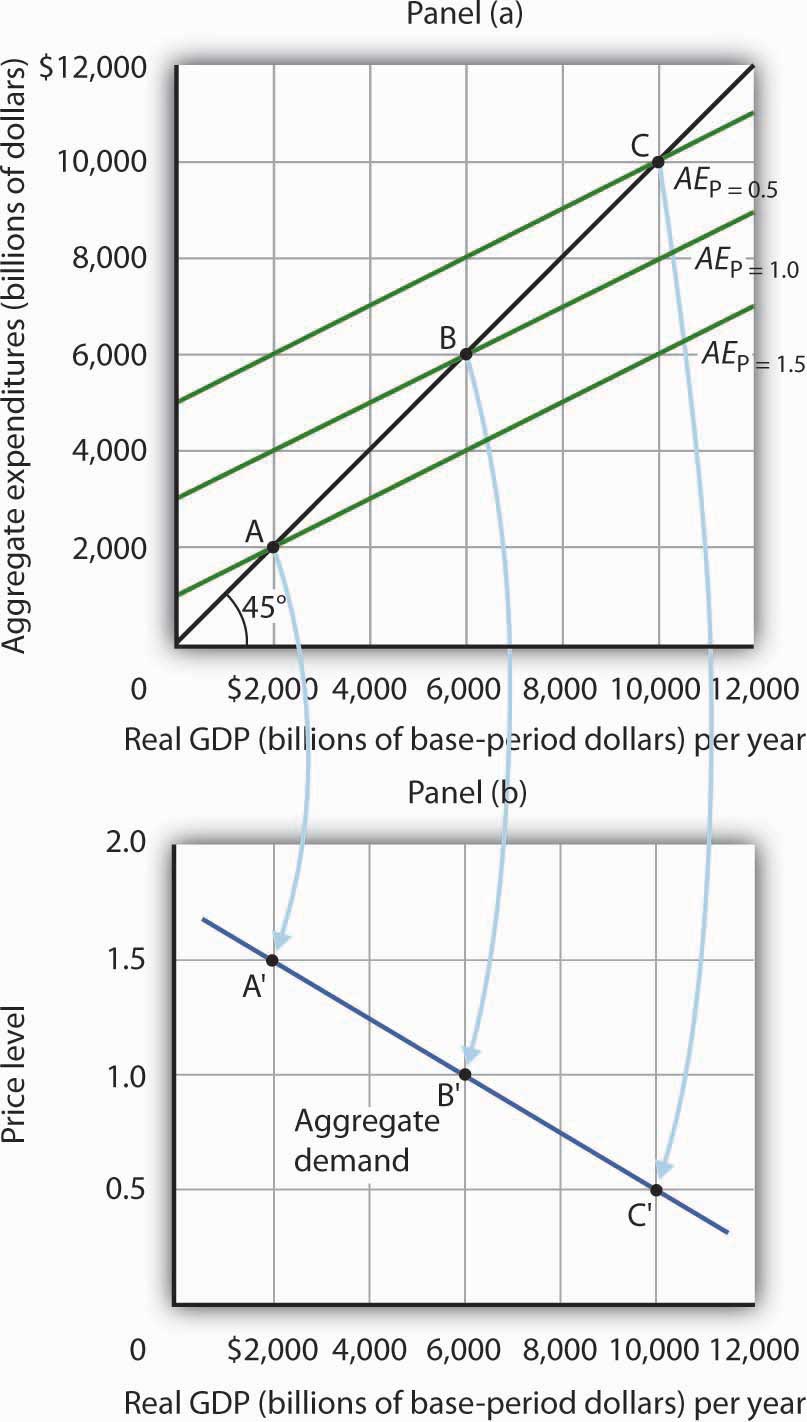 Panel (a) of Figure 28.13 "From Aggregate Expenditures to Aggregate Demand" shows three possible aggregate expenditures curves for three different price levels. For example, the aggregate expenditures curve labeled AEP=1.0 is the aggregate expenditures curve for an economy with a price level of 1.0. Since that aggregate expenditures curve crosses the 45-degree line at $6,000 billion, equilibrium real GDP is $6,000 billion at that price level. At a lower price level, aggregate expenditures would rise because of the wealth effect, the interest rate effect, and the international trade effect. Assume that at every level of real GDP, a reduction in the price level to 0.5 would boost aggregate expenditures by $2,000 billion to AEP = 0.5, and an increase in the price level from 1.0 to 1.5 would reduce aggregate expenditures by $2,000 billion. The aggregate expenditures curve for a price level of 1.5 is shown as AEP=1.5. There is a different aggregate expenditures curve, and a different level of equilibrium real GDP, for each of these three price levels. A price level of 1.5 produces equilibrium at point A, a price level of 1.0 does so at point B, and a price level of 0.5 does so at point C. More generally, there will be a different level of equilibrium real GDP for every price level; the higher the price level, the lower the equilibrium value of real GDP.