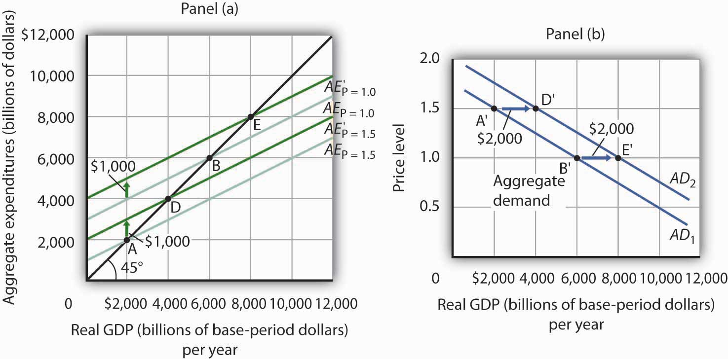 A $1,000-billion increase in net exports shifts each of the aggregate expenditures curves up by $1,000 billion, to AE′P=1.0 and AE′P=1.5. That changes the equilibrium real GDP associated with each price level; it thus shifts the aggregate demand curve to AD2 in Panel (b). In the aggregate expenditures model, equilibrium real GDP changes by an amount equal to the initial change in autonomous aggregate expenditures times the multiplier, so the aggregate demand curve shifts by the same amount. In this example, we assume the multiplier is 2. The aggregate demand curve thus shifts to the right by $2,000 billion, two times the $1,000-billion change in autonomous aggregate expenditures.