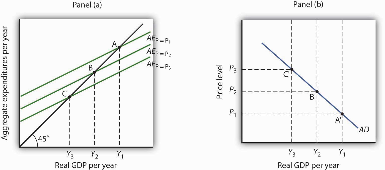 The lowest price level, P1, corresponds to the highest AE curve, AEP = P1, as shown. This suggests a downward-sloping aggregate demand curve. Points A, B, and C on the AE curve correspond to points A′, B′, and C′ on the AD curve, respectively.