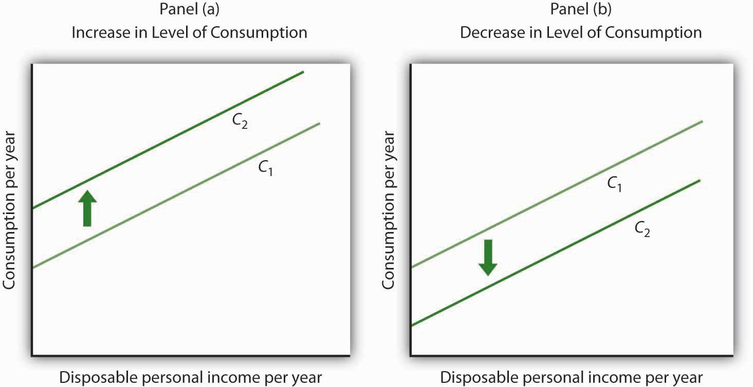 An increase in the level of consumption at each level of disposable personal income shifts the consumption function upward in Panel (a). Among the events that would shift the curve upward are an increase in real wealth and an increase in consumer confidence. A reduction in the level of consumption at each level of disposable personal income shifts the curve downward in Panel (b). The events that could shift the curve downward include a reduction in real wealth and a decline in consumer confidence.
