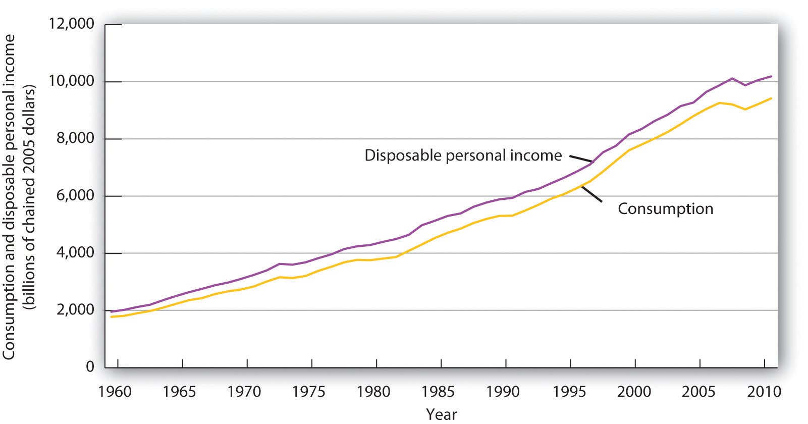 Real values of disposable personal income and consumption per year from 1960 through 2011 are plotted in Figure 28.1 "The Relationship between Consumption and Disposable Personal Income, 1960–2011". The data suggest that consumption generally changes in the same direction as does disposable personal income.